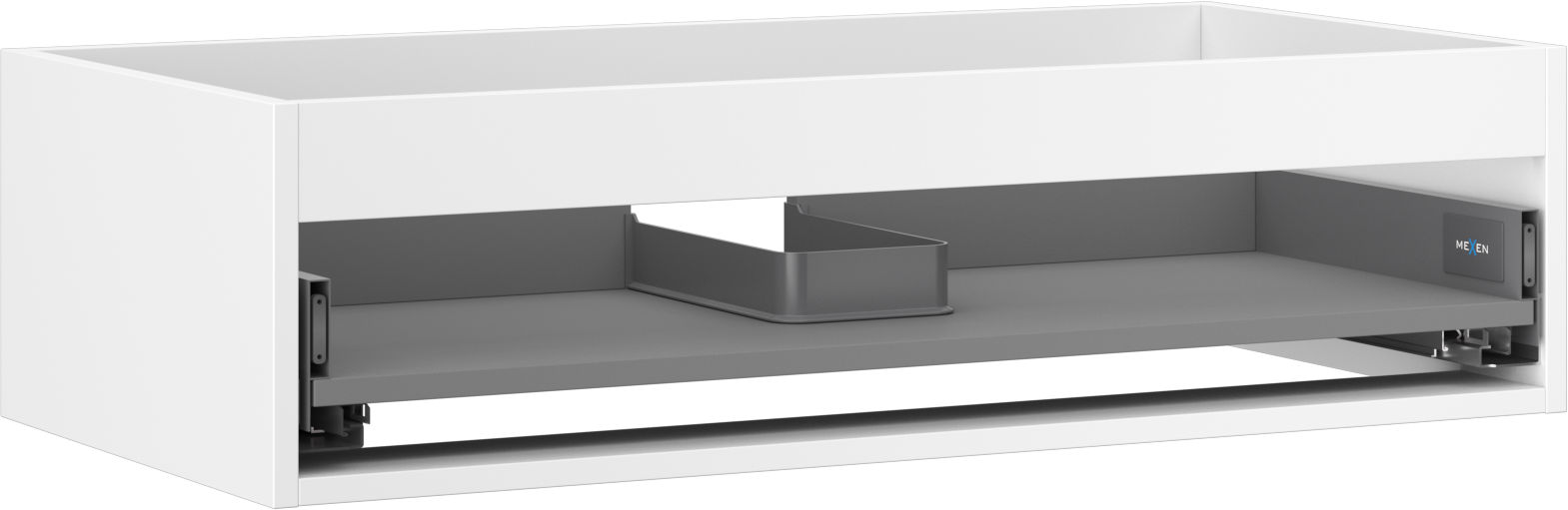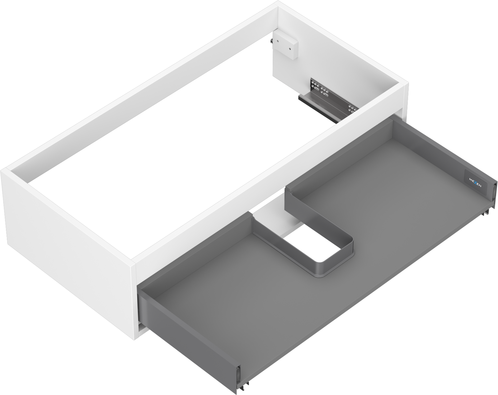 Utskärningen i lådan är utformad på ett sådant sätt att den rymmer vattenlåset som är nödvändigt i tvättställsinstallationer. Tack vare detta kan möbeln installeras fullt ut funktionellt, utan att behöva avstå från utrymme i lådan för installationen.