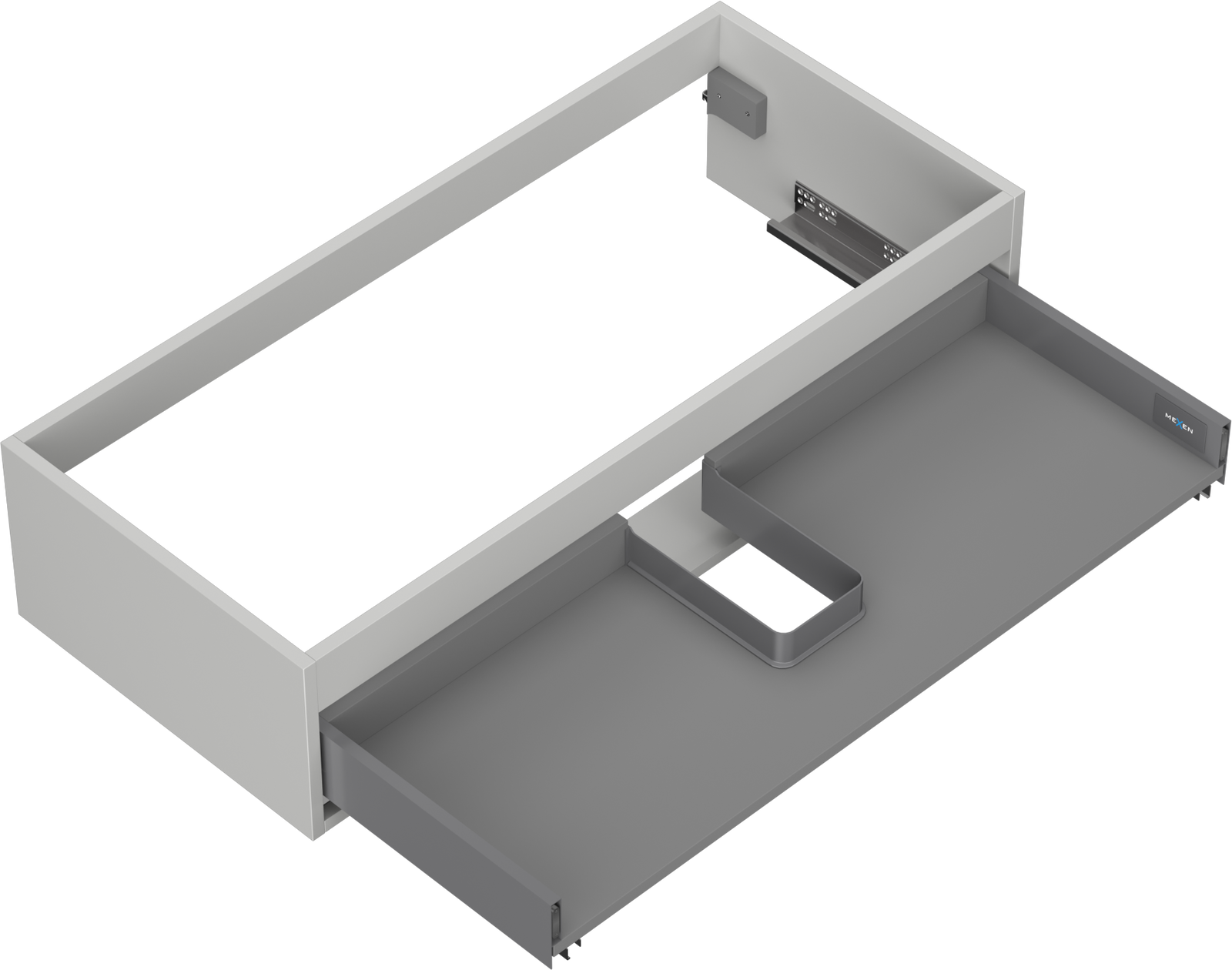 Utskärningen i lådan är utformad på ett sådant sätt att den rymmer vattenlåset som är nödvändigt i tvättställsinstallationer. Tack vare detta kan möbeln installeras fullt ut funktionellt, utan att behöva avstå från utrymme i lådan för installationen.