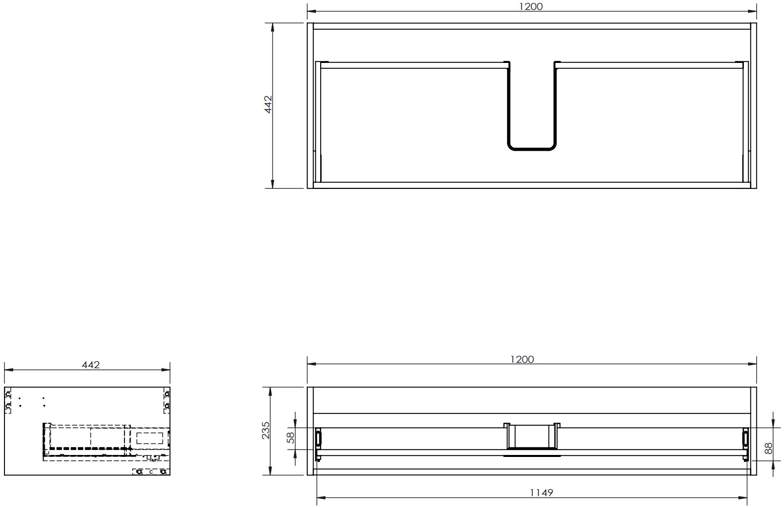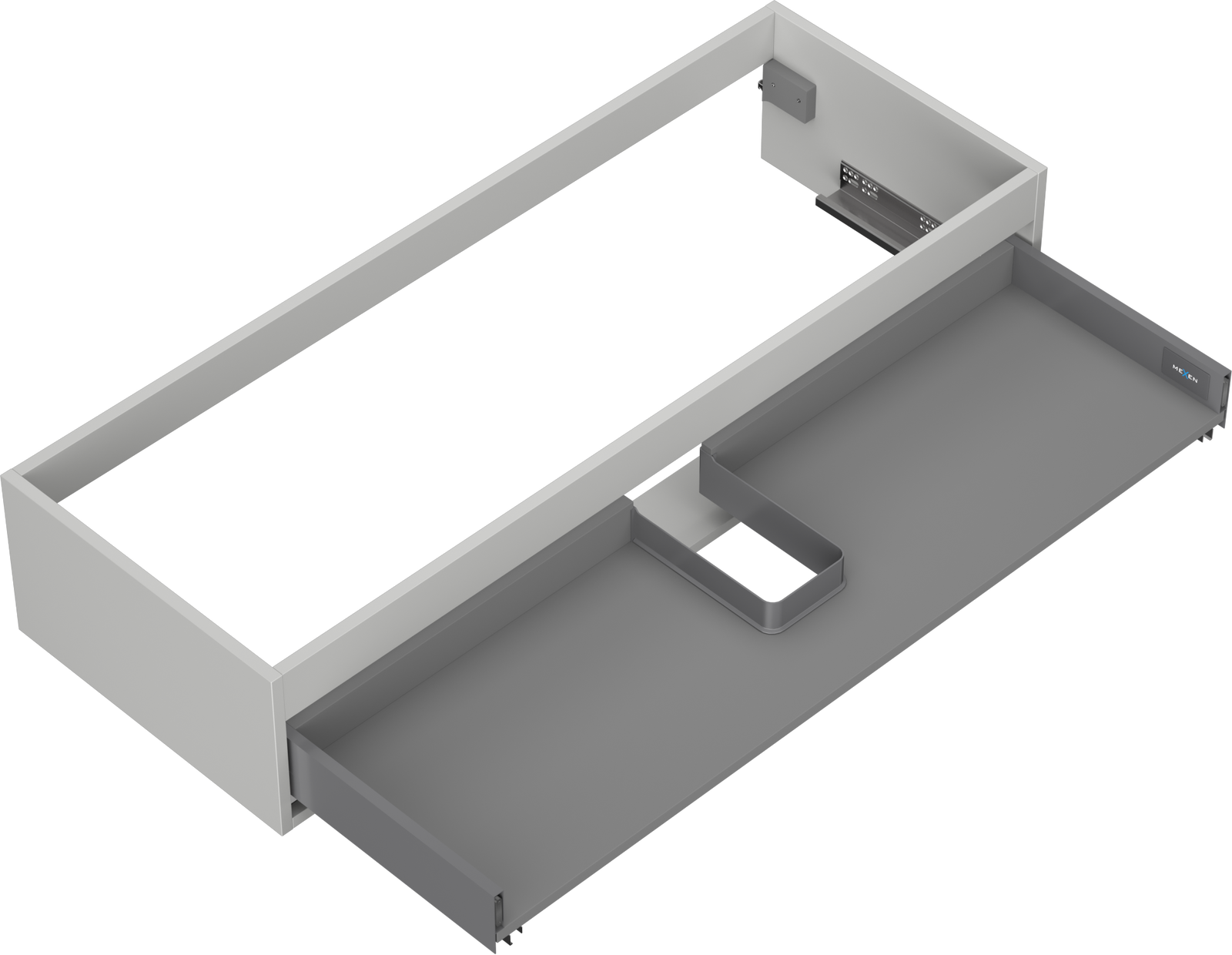Utskärningen i lådan är utformad på ett sådant sätt att den rymmer vattenlåset som är nödvändigt i tvättställsinstallationer. Tack vare detta kan möbeln installeras fullt ut funktionellt, utan att behöva avstå från utrymme i lådan för installationen.