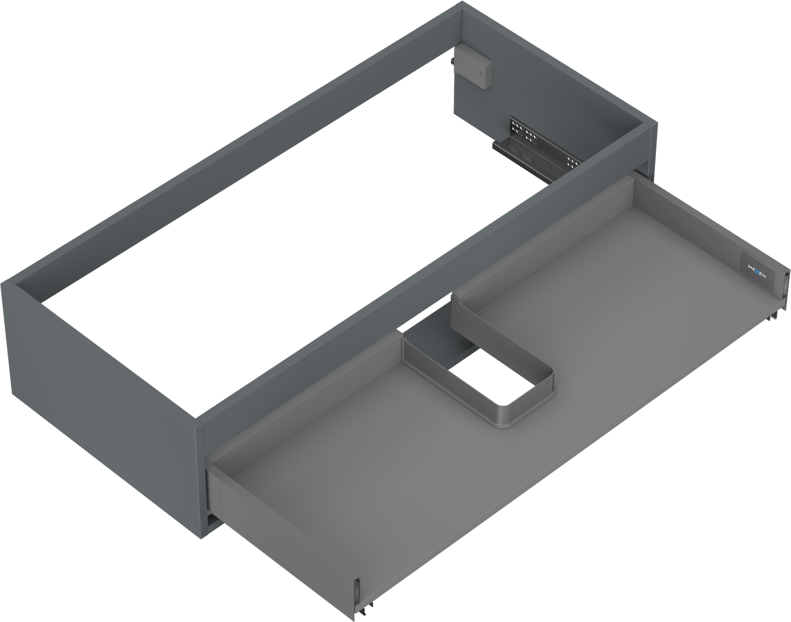 Utskärningen i lådan är utformad på ett sådant sätt att den rymmer vattenlåset som är nödvändigt i tvättställsinstallationer. Tack vare detta kan möbeln installeras fullt ut funktionellt, utan att behöva avstå från utrymme i lådan för installationen.
