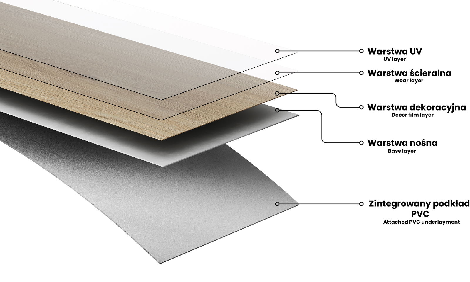 När man lägger vinylpaneler är det viktigt att använda ett underlag som fungerar som värme- och ljudisolering och som också garanterar golvets stabilitet. Vår produkt har ett integrerat underlag - tack vare denna lösning behöver vi inte lägga ut ytterligare material på golvet, vilket gör det mycket mer bekvämt och snabbt att lägga golvet.