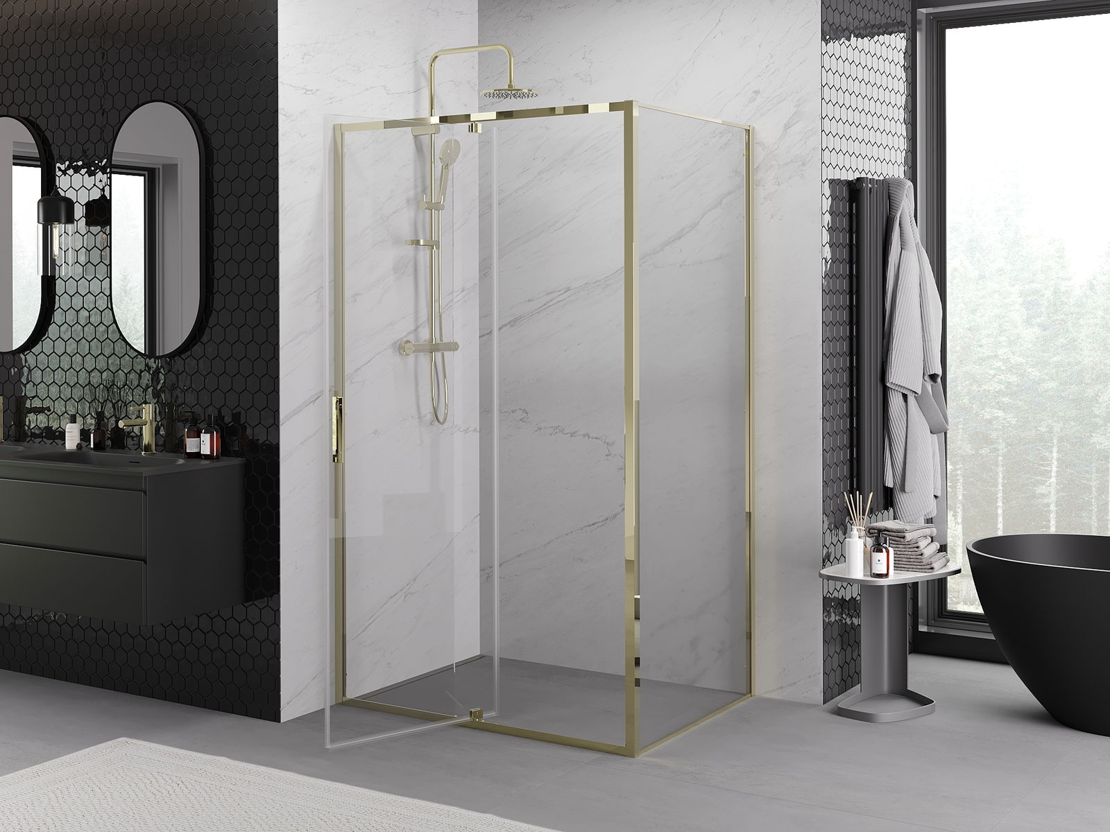 Det praktiska och bekväma handtaget är tillverkat av hållbar och tålig metall. Den moderna formen i kombination med en finish som matchar profilernas färg ger helheten ett modernt och stilfullt utseende, samtidigt som det framhäver estetiken i varje badrum.