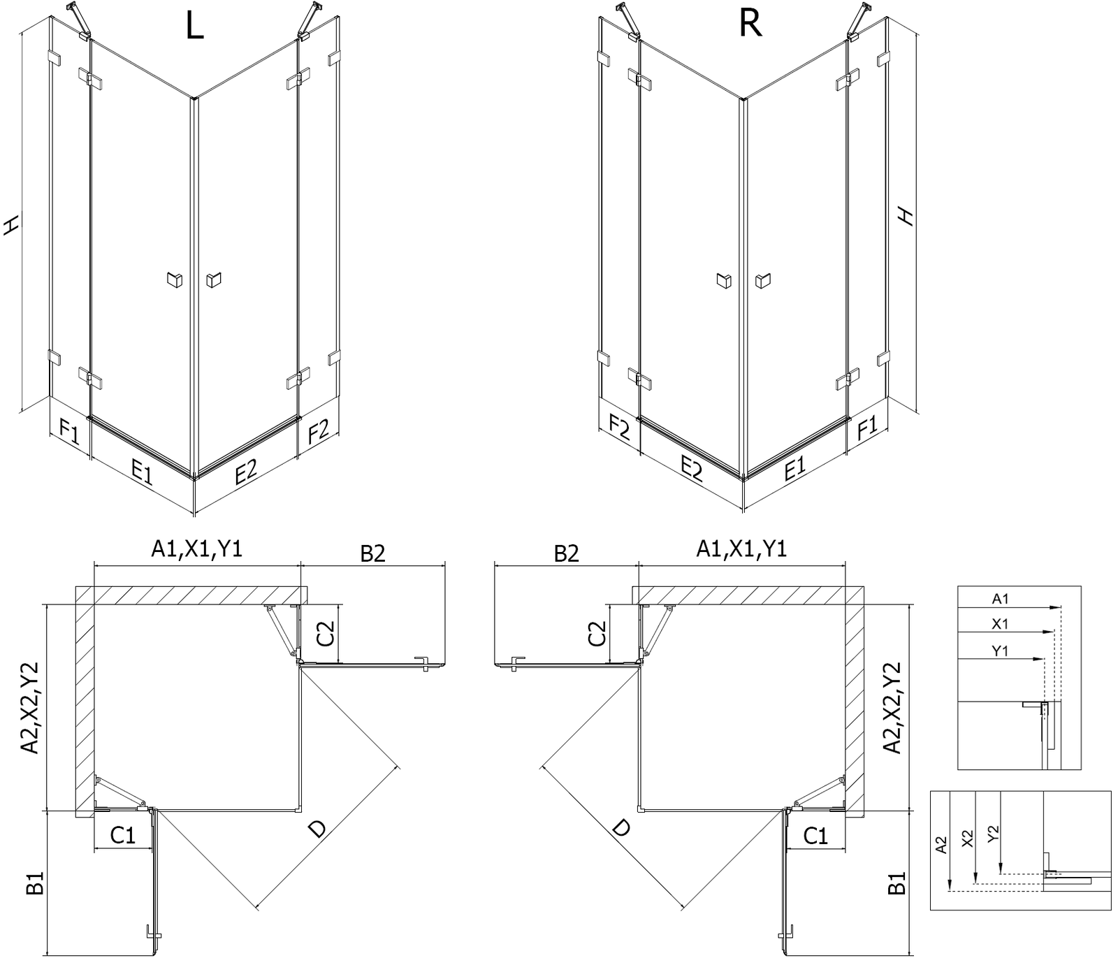 Duschkabiner, dörrar och väggar är som standard anpassade för montering på duschkar med specifika mått. Det är dessa mått som anges i produktnamnet eller beskrivningen. Observera dock att de faktiska måtten på delarna kan skilja sig något från de nominella värdena. Vid planerad montering direkt på golvet rekommenderas en noggrann kontroll av de utvändiga måtten och placeringen av delarna enligt den tekniska ritningen.