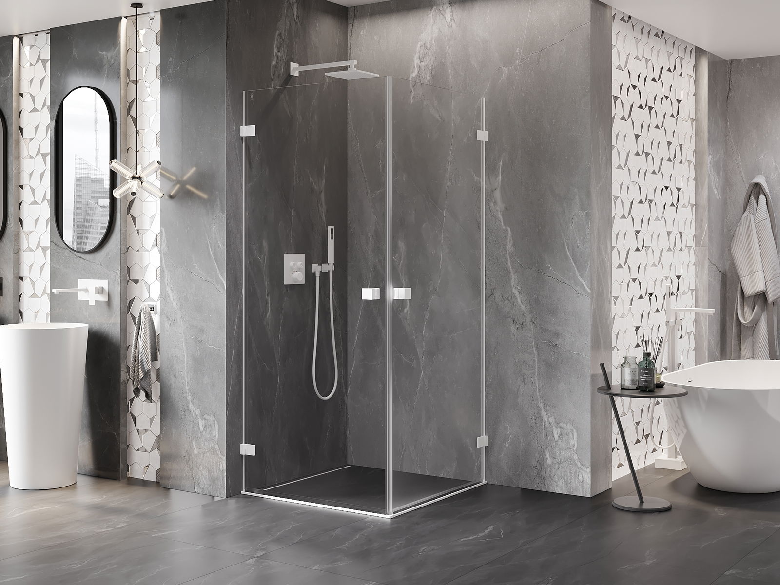 Det praktiska och bekväma handtaget är tillverkat av hållbar och tålig metall. Den moderna formen i kombination med en finish som matchar profilernas färg ger helheten ett modernt och stilfullt utseende, samtidigt som det framhäver estetiken i varje badrum.