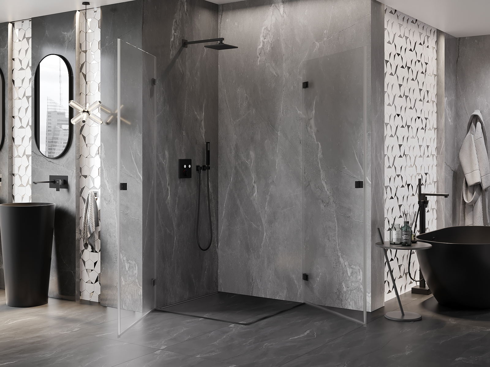 Det praktiska och bekväma handtaget är tillverkat av hållbar och tålig metall. Den moderna formen i kombination med en finish som matchar profilernas färg ger helheten ett modernt och stilfullt utseende, samtidigt som det framhäver estetiken i varje badrum.