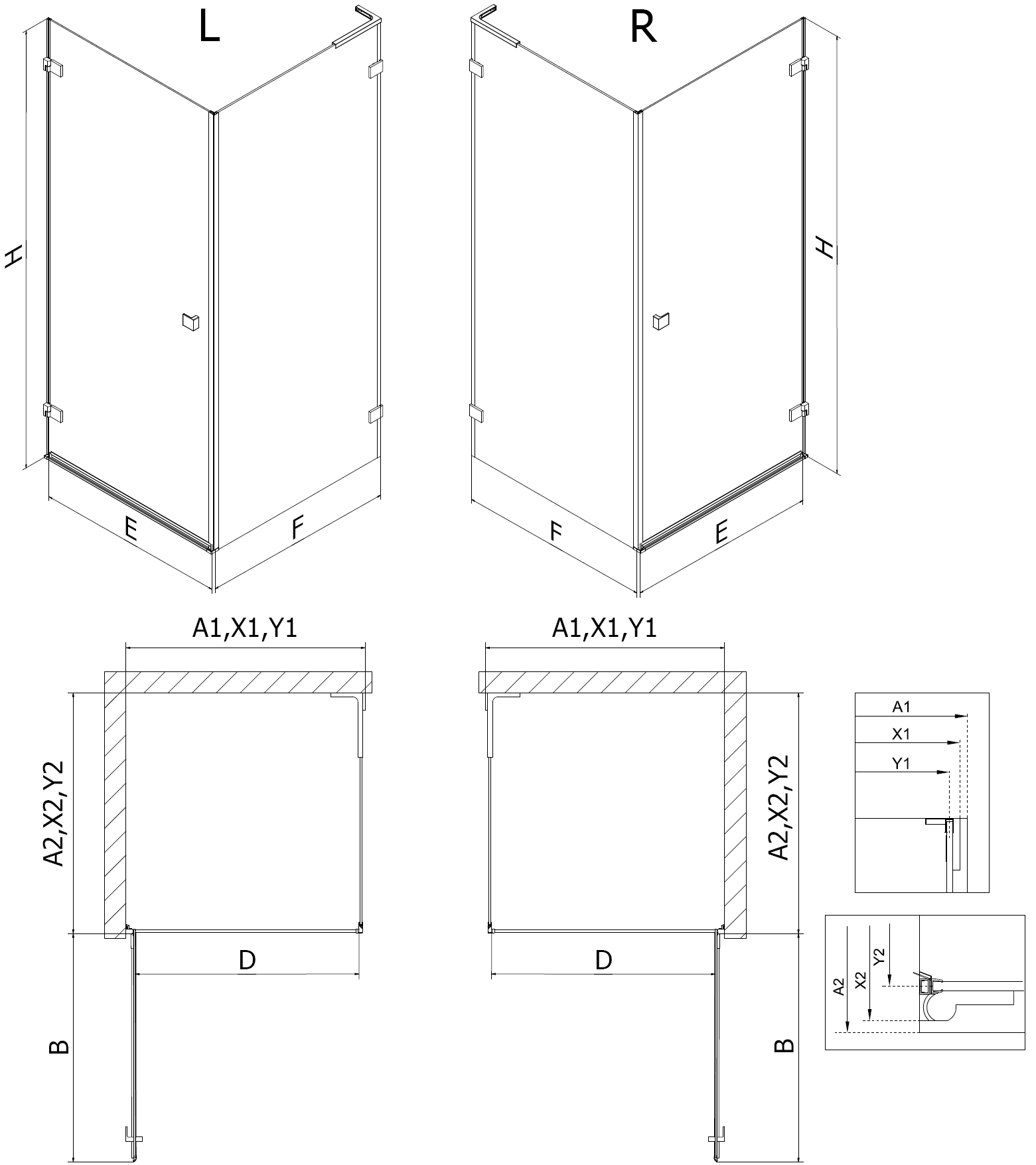 Storlek: 90x90 cm (vänster dörr 90 cm, vägg 90 cm)