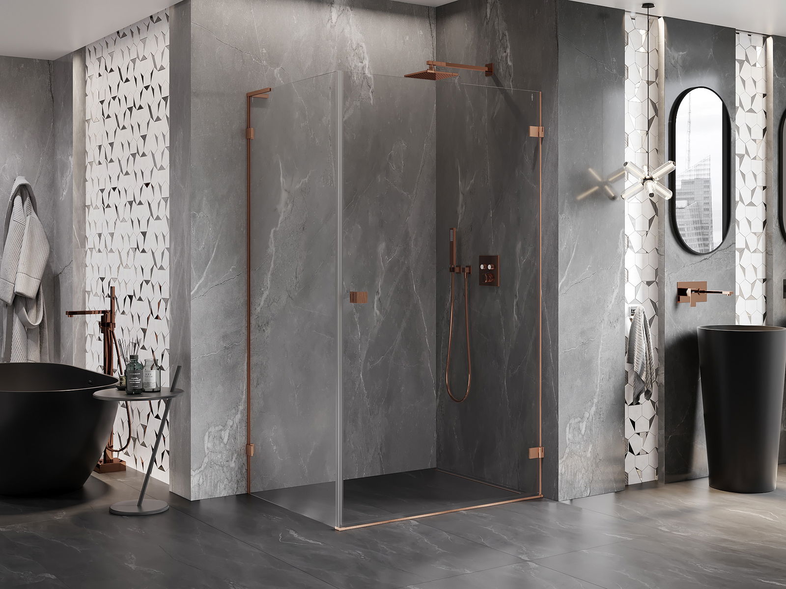 Det praktiska och bekväma handtaget är tillverkat av hållbar och tålig metall. Den moderna formen i kombination med en finish som matchar profilernas färg ger helheten ett modernt och stilfullt utseende, samtidigt som det framhäver estetiken i varje badrum.