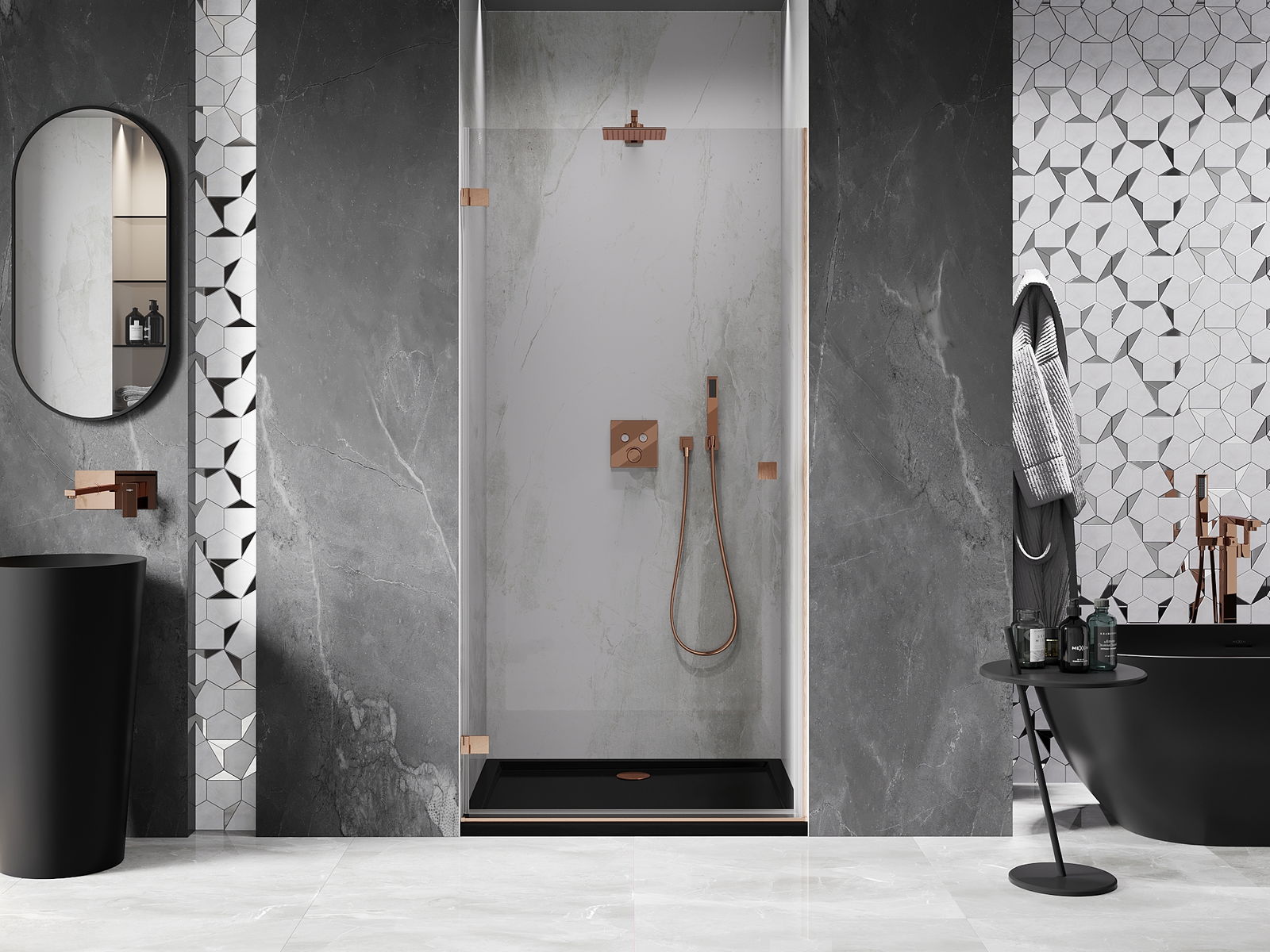 Det praktiska och bekväma handtaget är tillverkat av hållbar och tålig metall. Den moderna formen i kombination med en finish som matchar profilernas färg ger helheten ett modernt och stilfullt utseende, samtidigt som det framhäver estetiken i varje badrum.