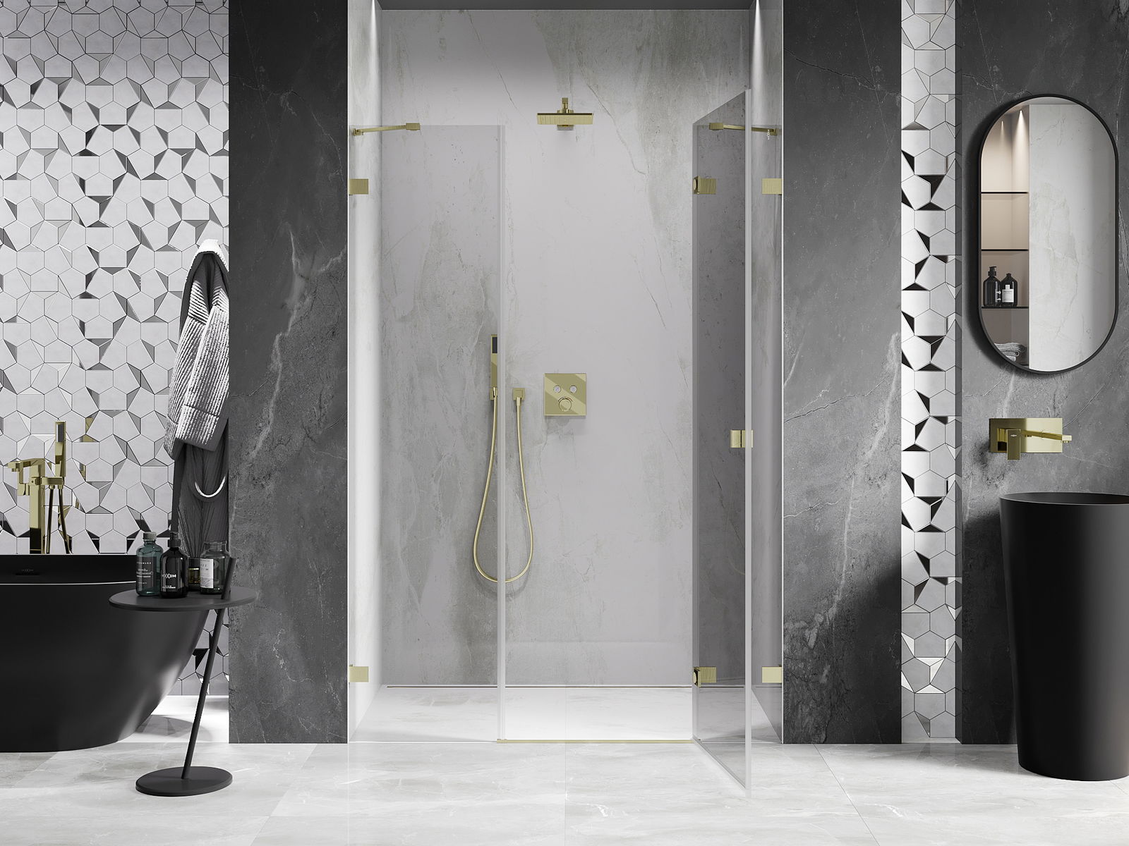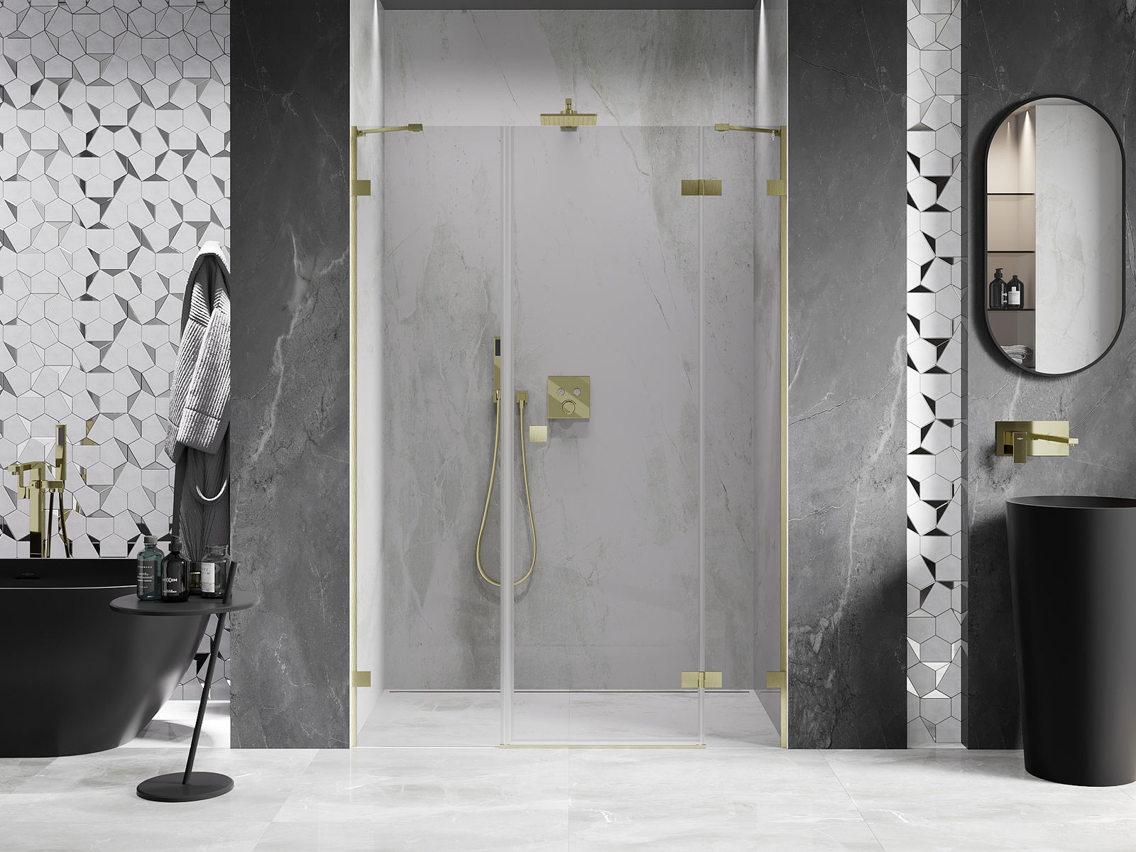 Klammor och gångjärn är gjorda av mycket hållbar mässing och bildar dessutom en inpassad glasruta. Det är ett utmärkt val som kombinerar elegans, hållbarhet och modern design. Tack vare sådana lösningar vinner duschen i estetik och underlättar samtidigt underhåll av renlighet.