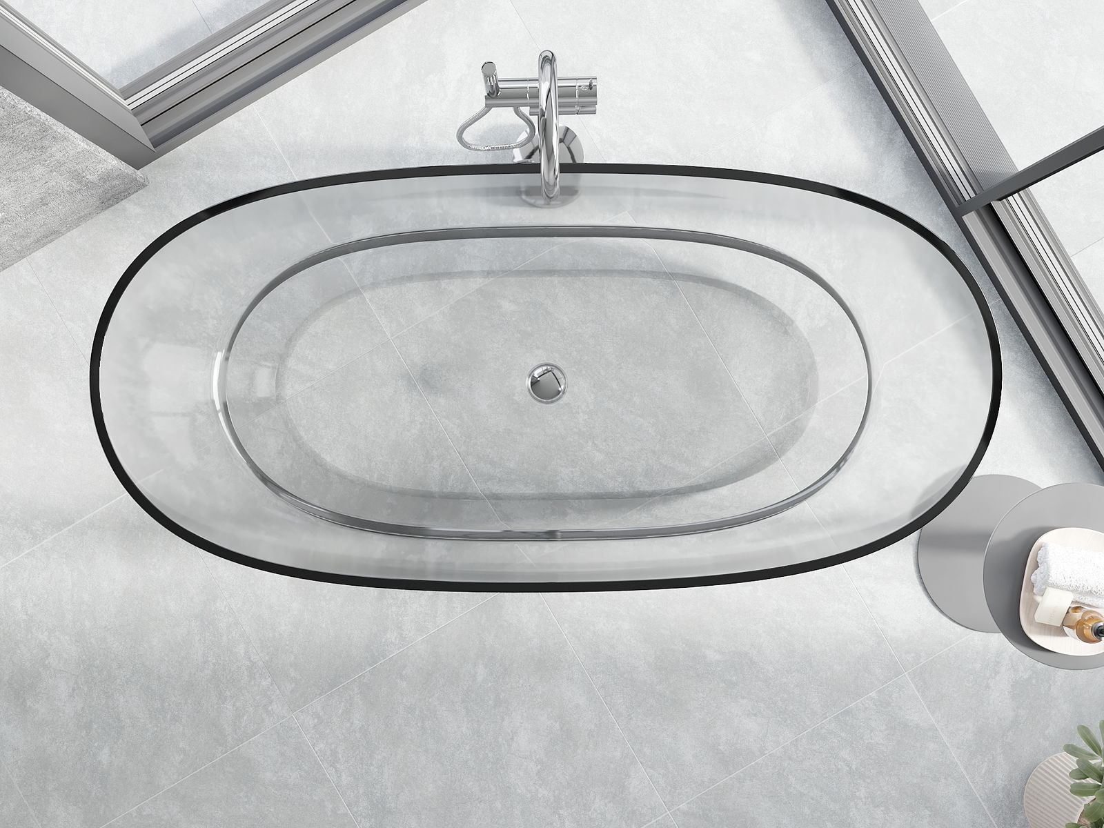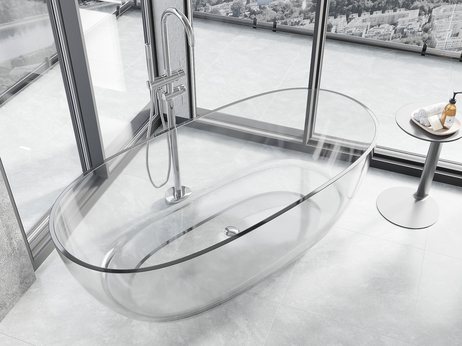 Detta är ett modernt material som kombinerar elegant utseende med hög hållbarhet. Det är resistent mot mekaniska skador, lätt att rengöra och behagligt att ta på. Den transparenta formen och det tunna kantrandet på badkaret ger det lätthet och en unik karaktär, vilket skapar en imponerande accent i badrumsinredningen.