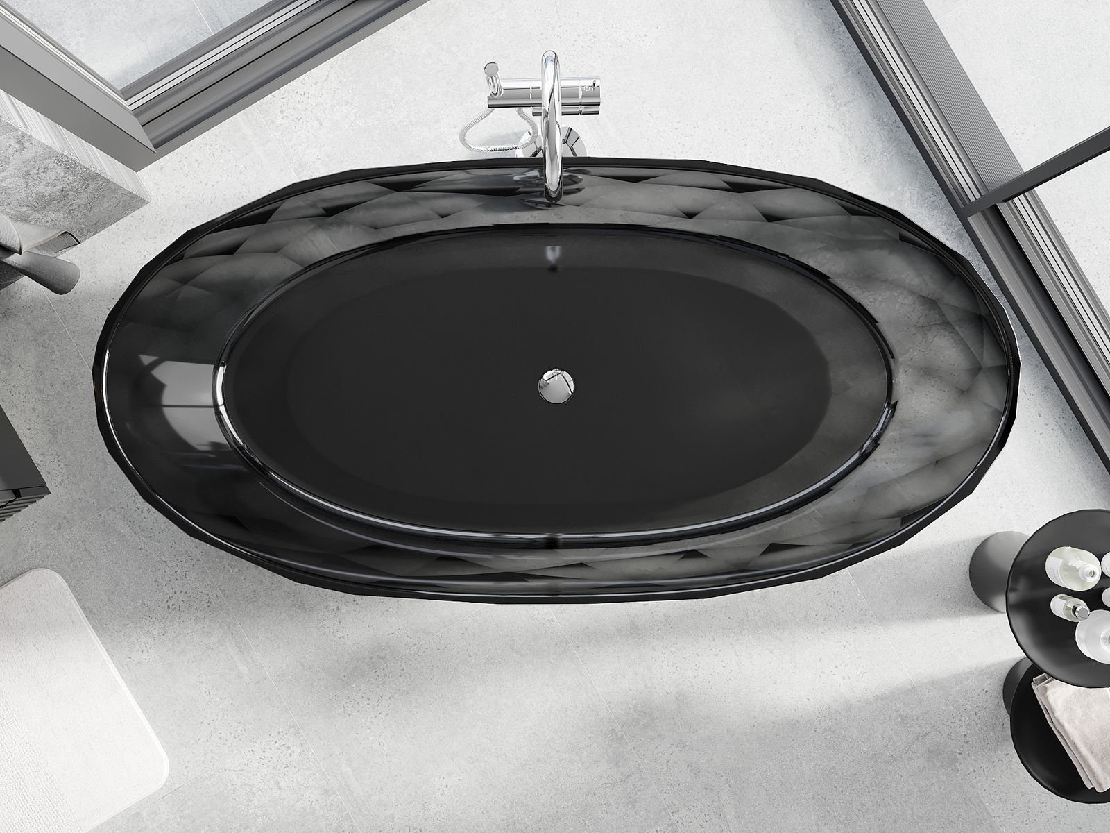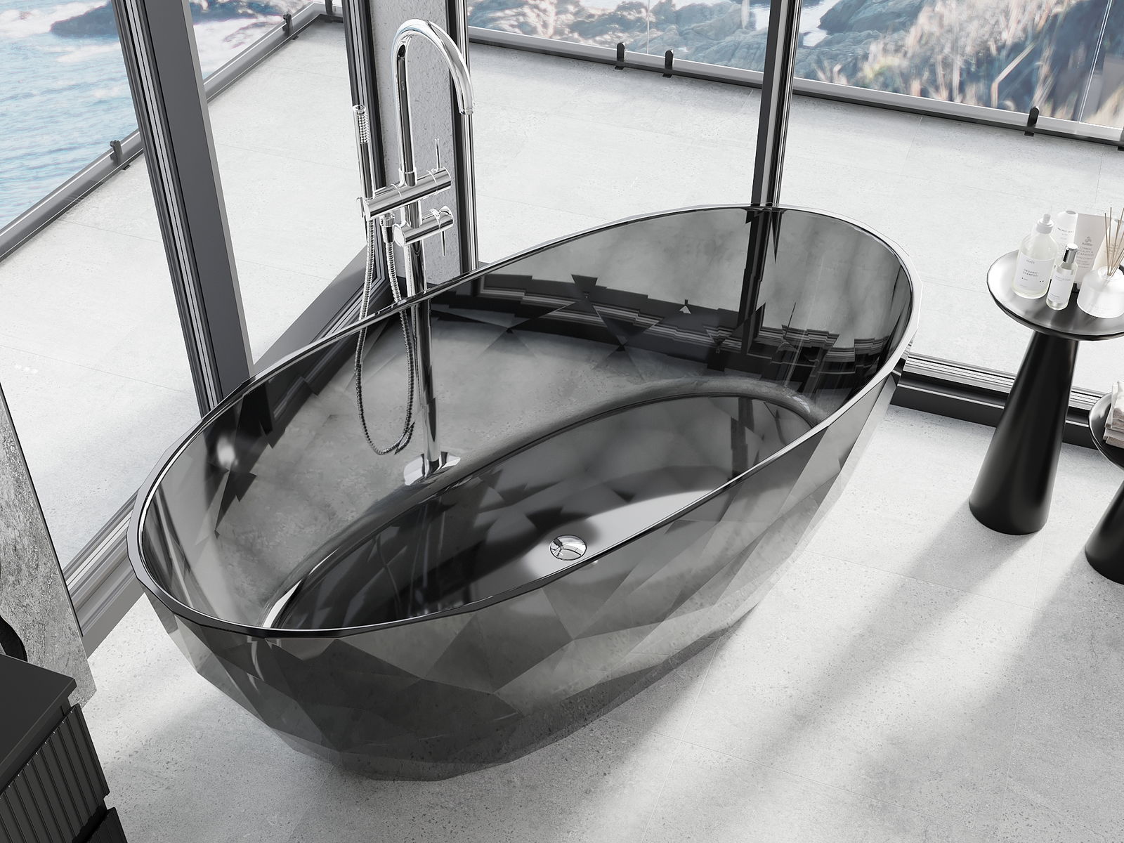 Detta är ett modernt material som kombinerar elegant utseende med hög hållbarhet. Det är resistent mot mekaniska skador, lätt att rengöra och behagligt att ta på. Den transparenta formen och det tunna kantrandet på badkaret ger det lätthet och en unik karaktär, vilket skapar en imponerande accent i badrumsinredningen.