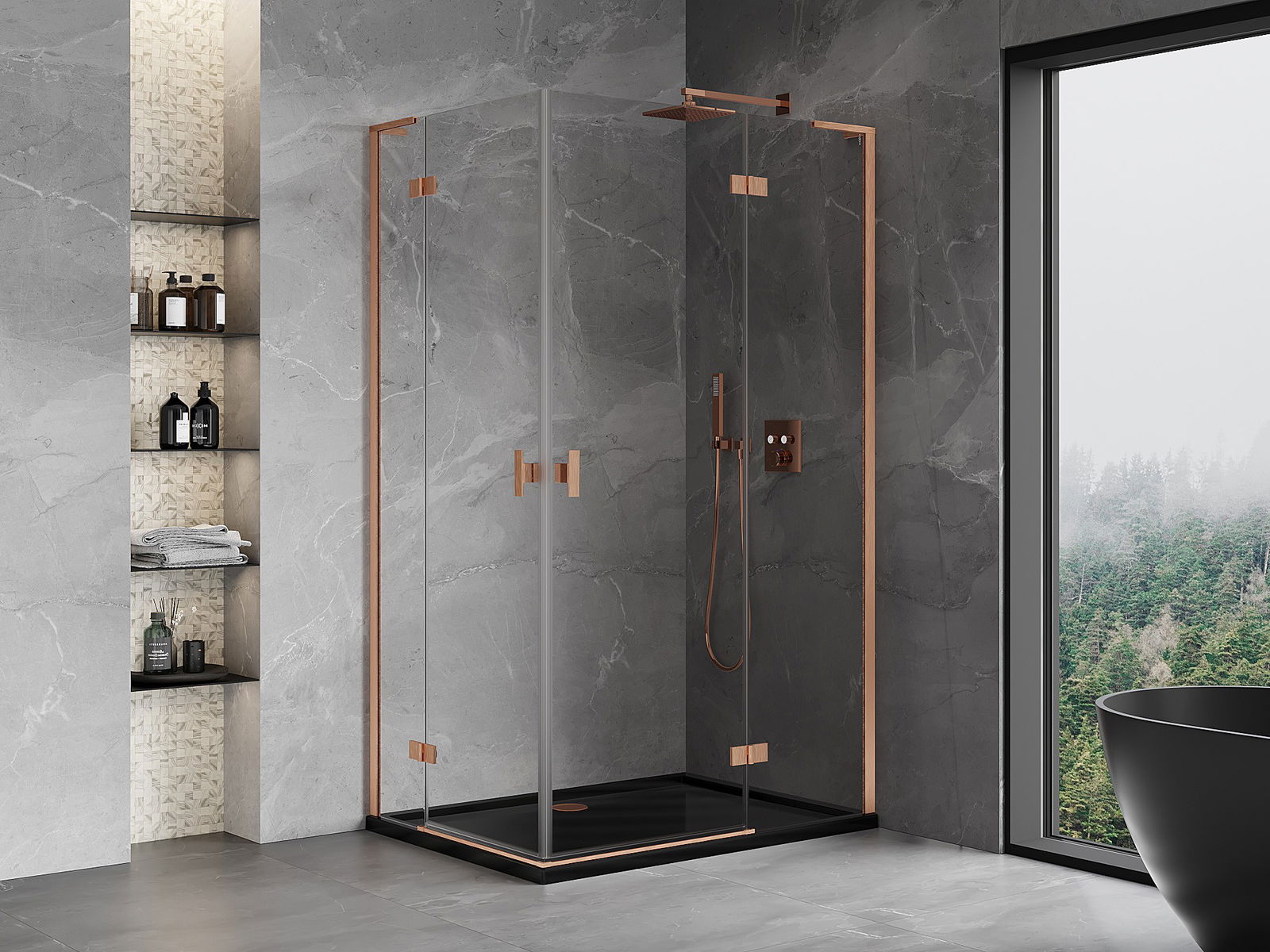 Mexen Mist-H L Duo duschkabin med höger svängbar dörr 85 x 90 cm, transparent, borstad koppar - 8A5L-085L-090P-65-00
