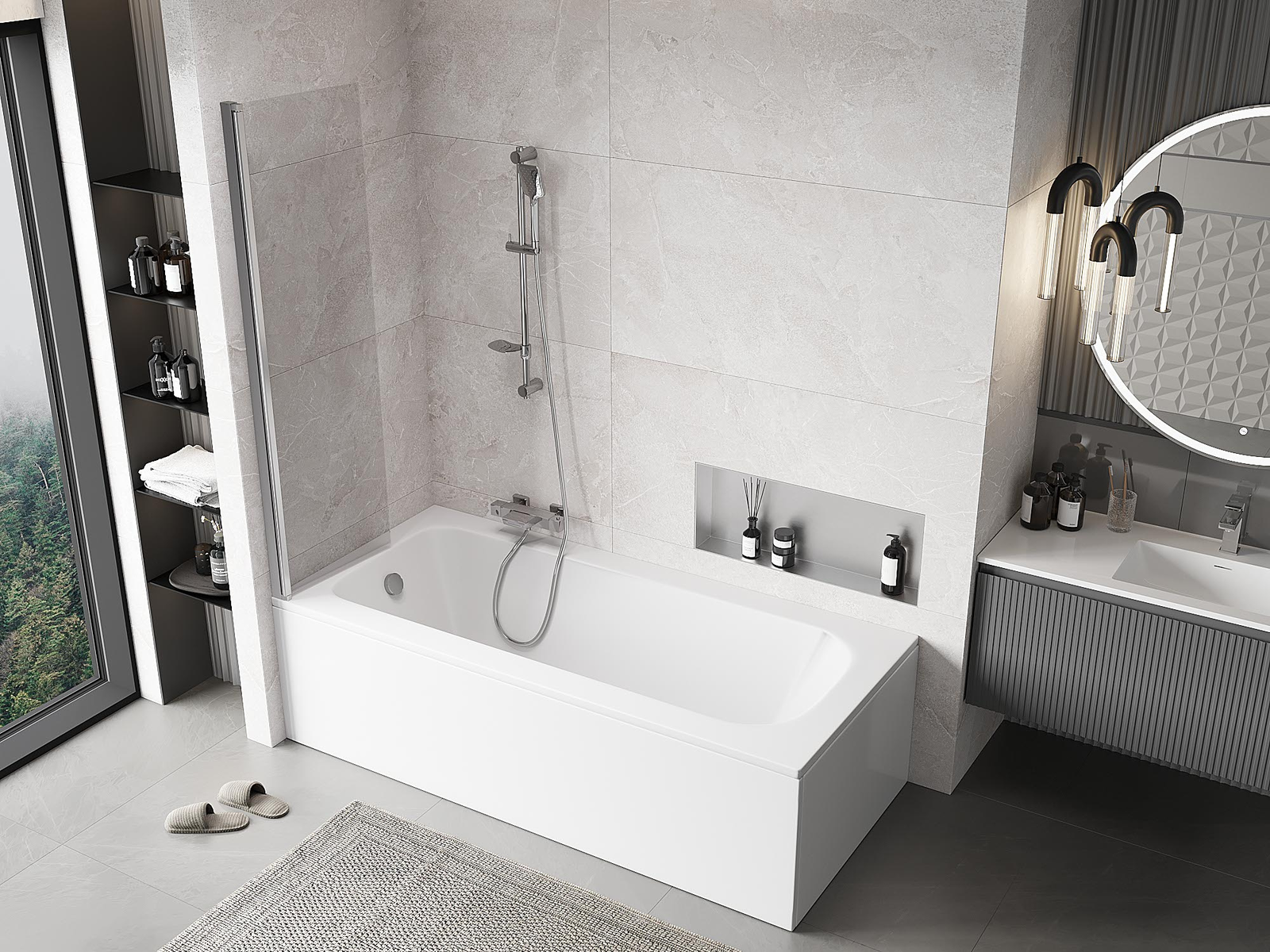 Skärmen har en rörlig vinge som kan fällas ihop. Denna lösning sparar mer utrymme i badrummet och möjliggör fri användning av det återstående utrymmet när vi inte använder badzonen.