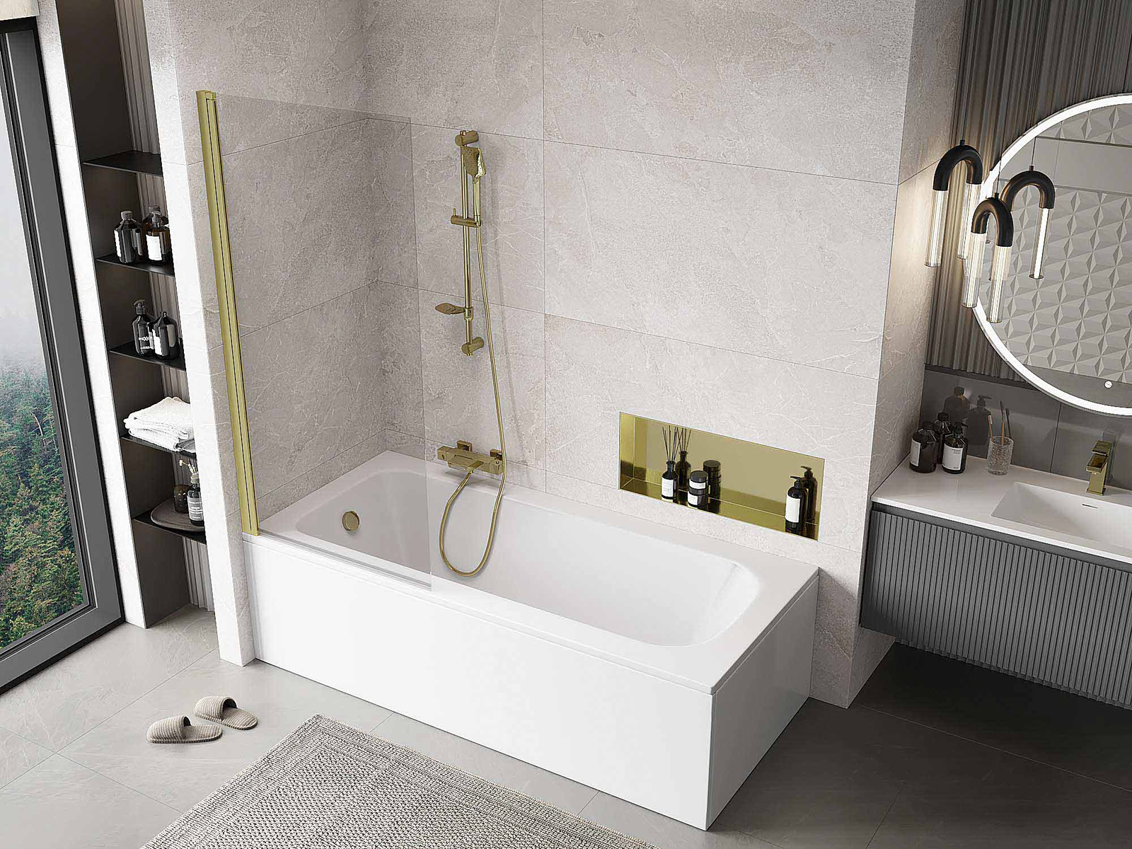 Skärmen har en rörlig vinge som kan fällas ihop. Denna lösning sparar mer utrymme i badrummet och möjliggör fri användning av det återstående utrymmet när vi inte använder badzonen.