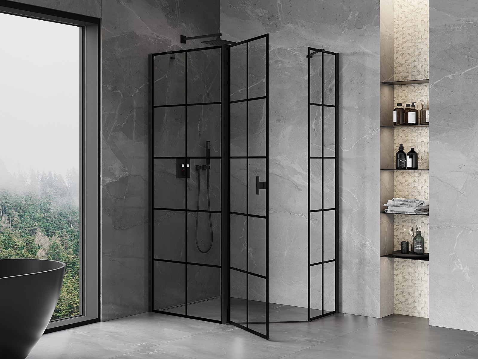 Mexen Mist asymmetrisk pentaduschkabin med svängdörr vänster 90 x 80 cm, svart rutnät, svart - 8A8-090-080-70-77-L