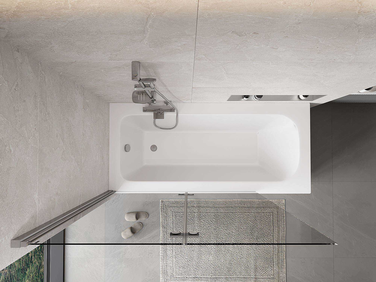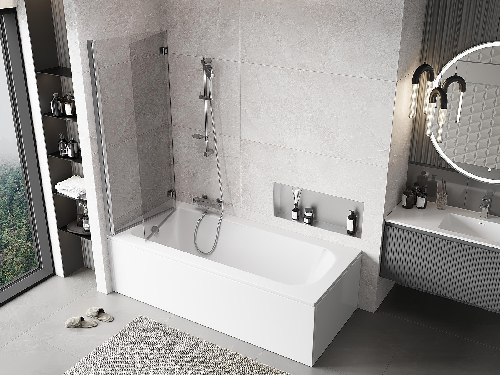 Skärmvägg tillverkad av två vingar med möjlighet att fällas ihop. En sådan lösning sparar mer utrymme i badrummet och möjliggör fri användning av det återstående utrymmet när vi inte använder badzonen.