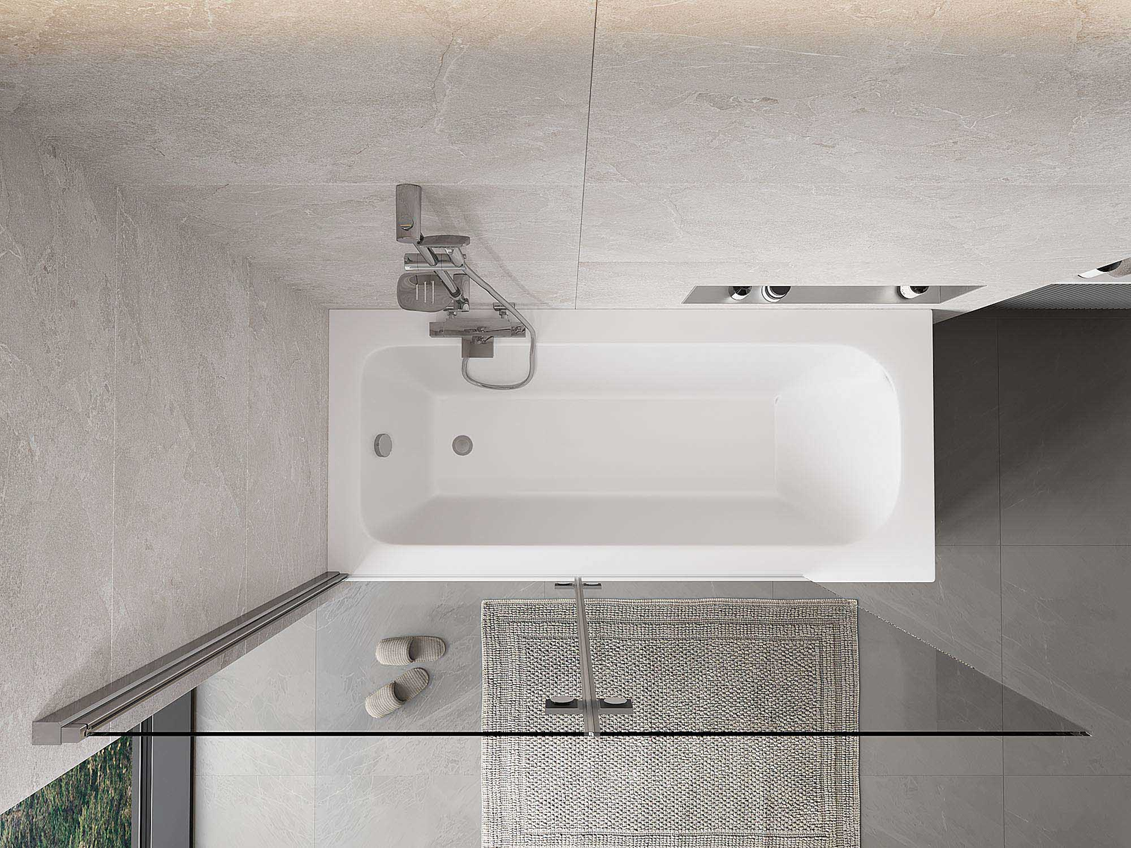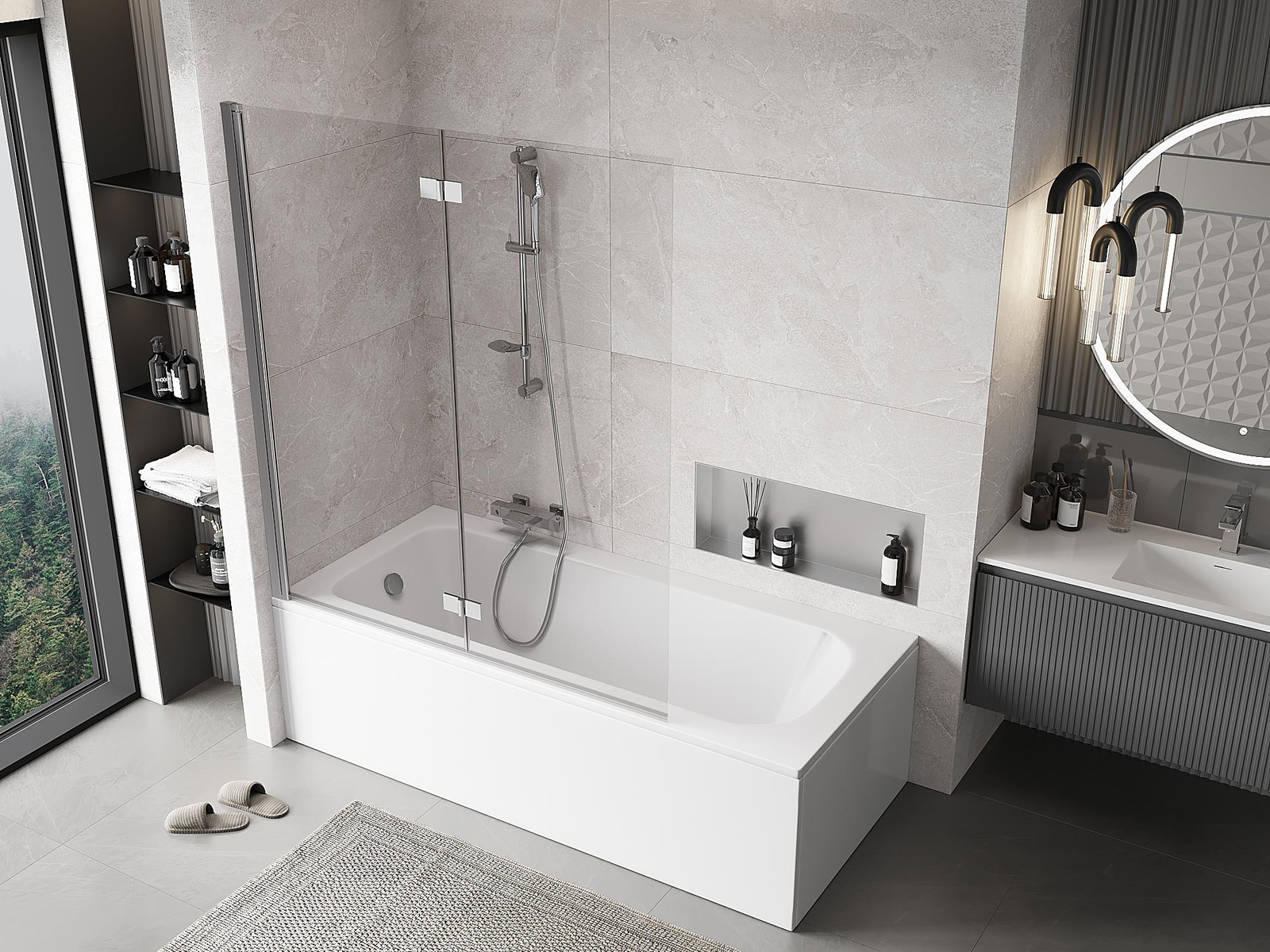 Skärmvägg tillverkad av två vingar med möjlighet att fällas ihop. En sådan lösning sparar mer utrymme i badrummet och möjliggör fri användning av det återstående utrymmet när vi inte använder badzonen.