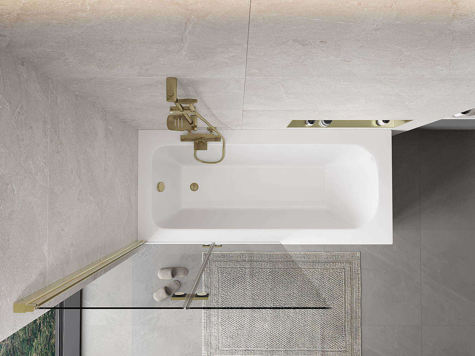 Skärmvägg tillverkad av två vingar med möjlighet att fällas ihop. En sådan lösning sparar mer utrymme i badrummet och möjliggör fri användning av det återstående utrymmet när vi inte använder badzonen.
