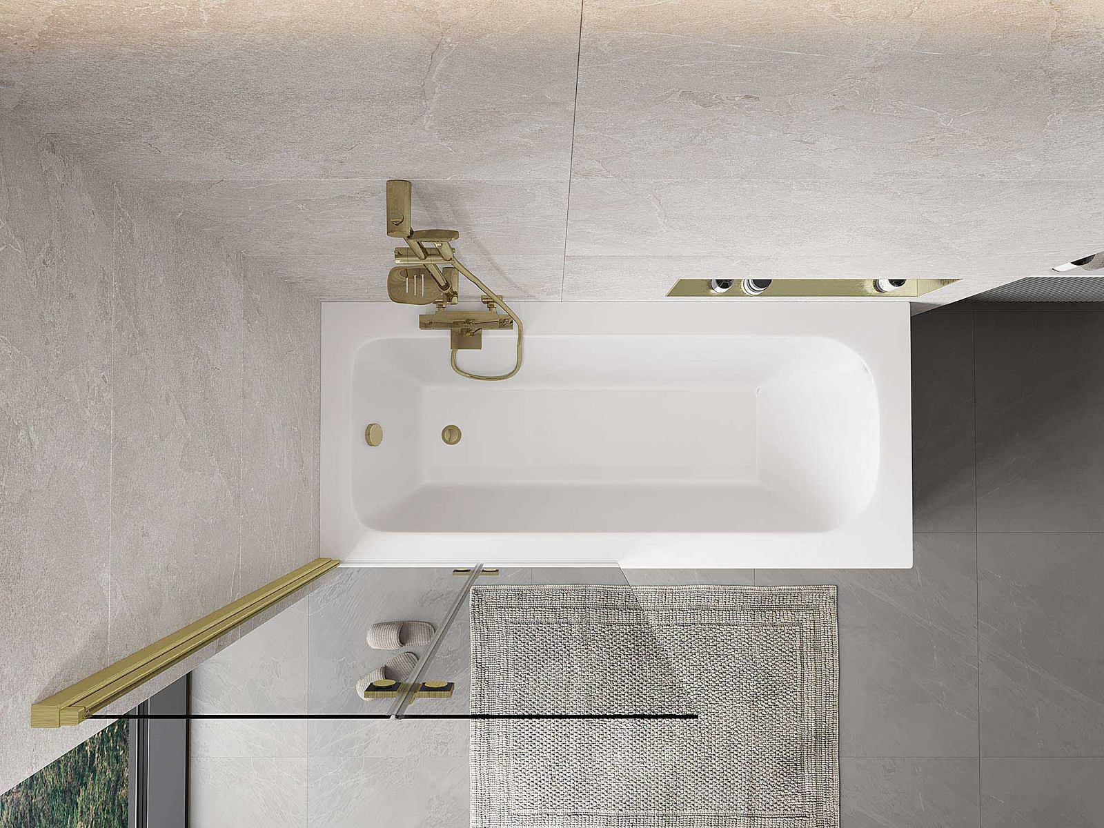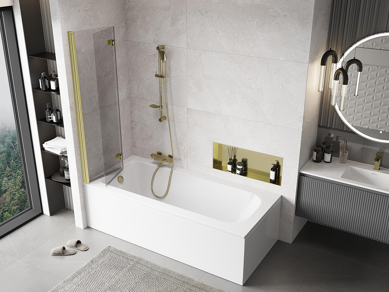 Skärmvägg tillverkad av två vingar med möjlighet att fällas ihop. En sådan lösning sparar mer utrymme i badrummet och möjliggör fri användning av det återstående utrymmet när vi inte använder badzonen.