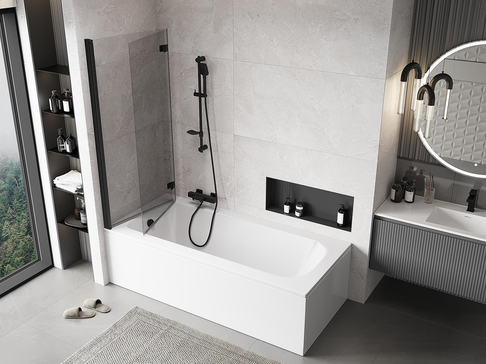 Skärmvägg tillverkad av två vingar med möjlighet att fällas ihop. En sådan lösning sparar mer utrymme i badrummet och möjliggör fri användning av det återstående utrymmet när vi inte använder badzonen.