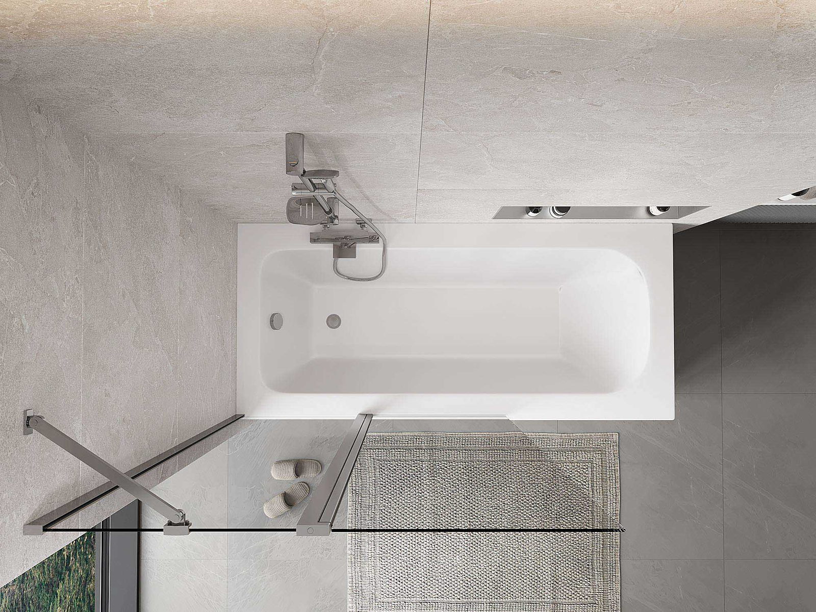 Skärmvägg tillverkad av två vingar med möjlighet att fällas ihop. En sådan lösning sparar mer utrymme i badrummet och möjliggör fri användning av det återstående utrymmet när vi inte använder badzonen.