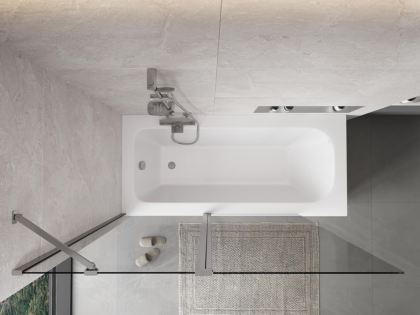 Skärmvägg tillverkad av två vingar med möjlighet att fällas ihop. En sådan lösning sparar mer utrymme i badrummet och möjliggör fri användning av det återstående utrymmet när vi inte använder badzonen.