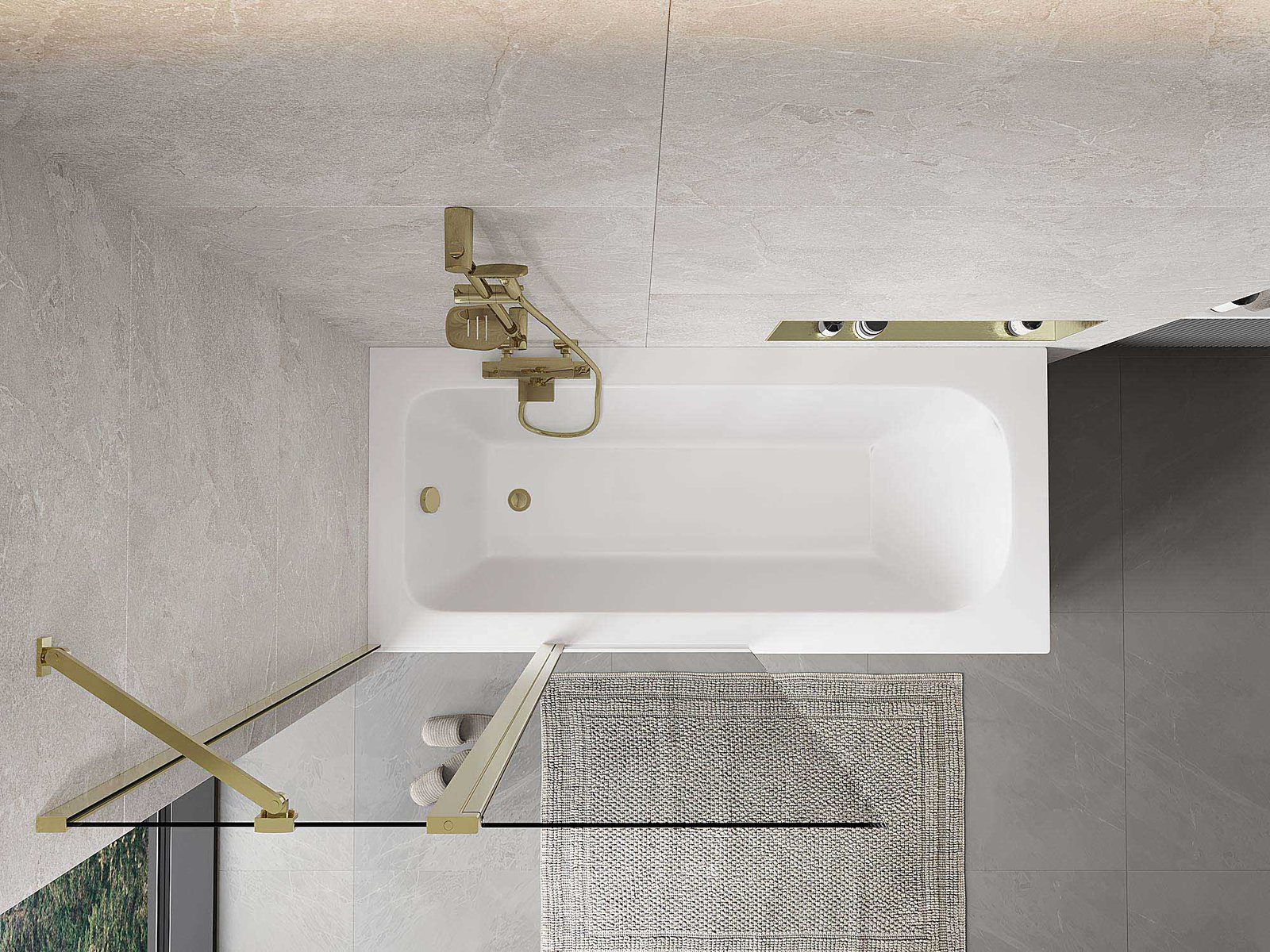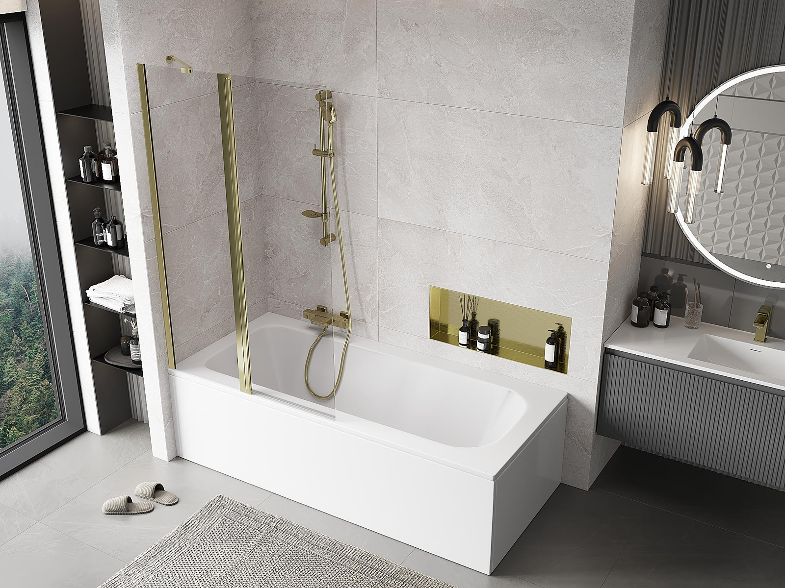 Skärmvägg tillverkad av två vingar med möjlighet att fällas ihop. En sådan lösning sparar mer utrymme i badrummet och möjliggör fri användning av det återstående utrymmet när vi inte använder badzonen.