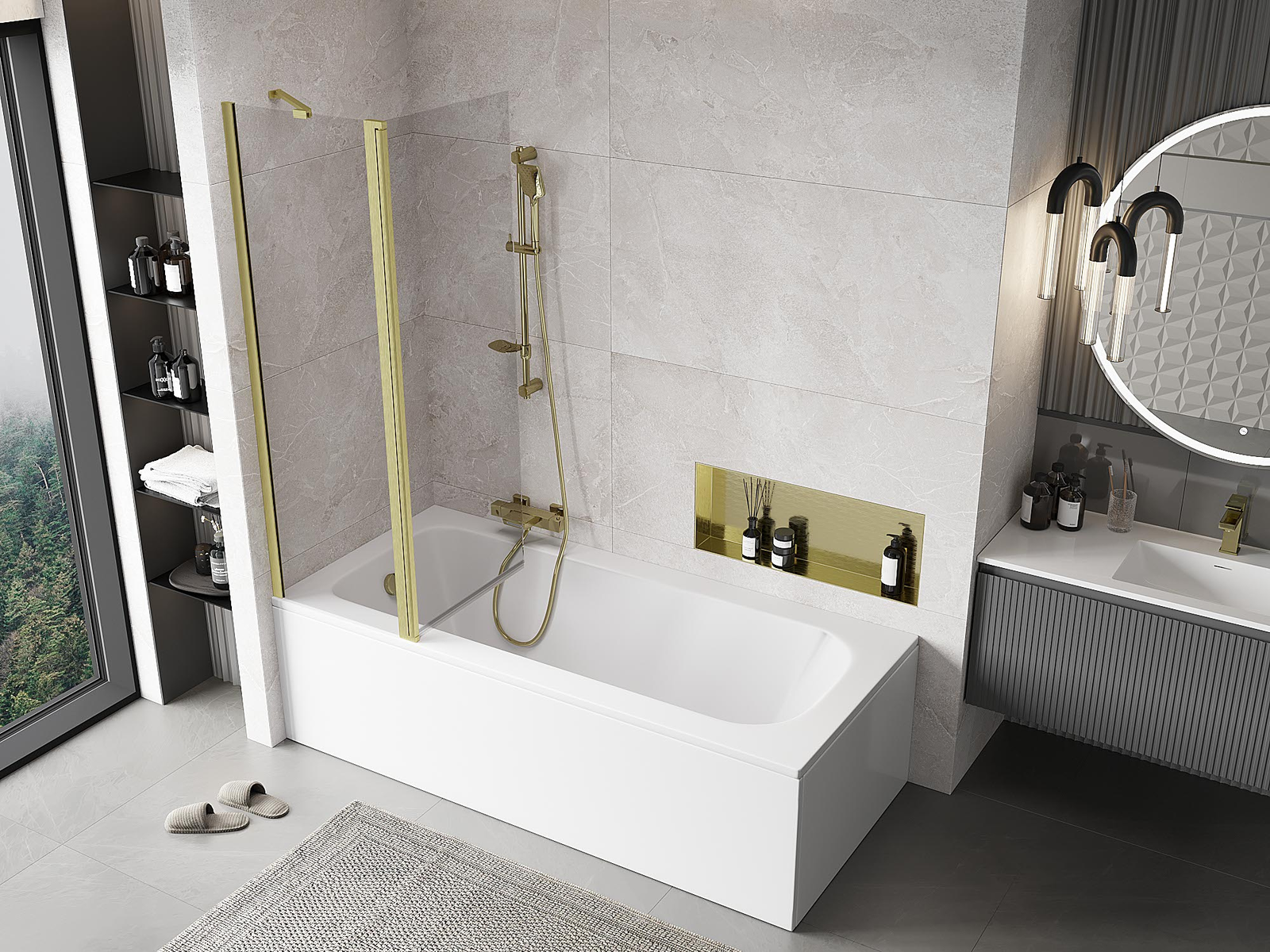 Skärmvägg tillverkad av två vingar med möjlighet att fällas ihop. En sådan lösning sparar mer utrymme i badrummet och möjliggör fri användning av det återstående utrymmet när vi inte använder badzonen.