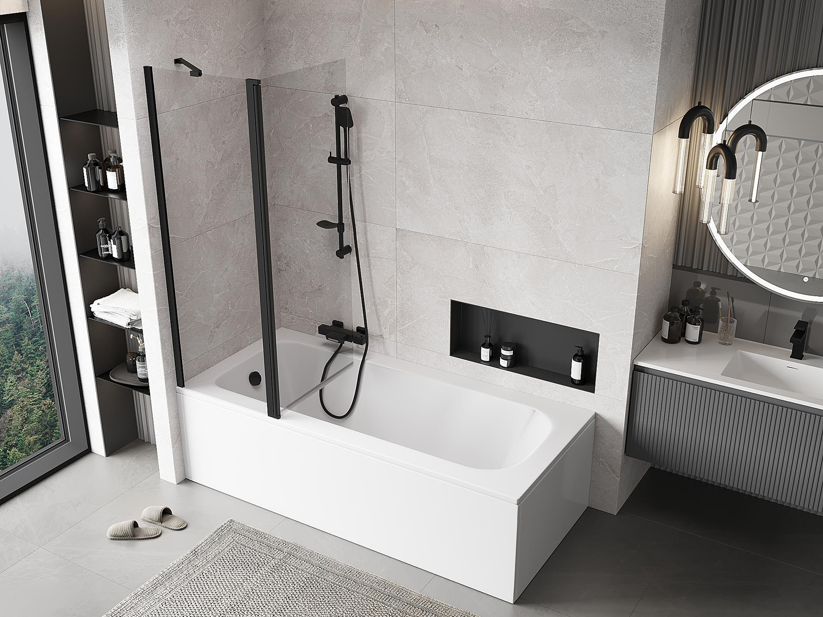 Skärmvägg tillverkad av två vingar med möjlighet att fällas ihop. En sådan lösning sparar mer utrymme i badrummet och möjliggör fri användning av det återstående utrymmet när vi inte använder badzonen.