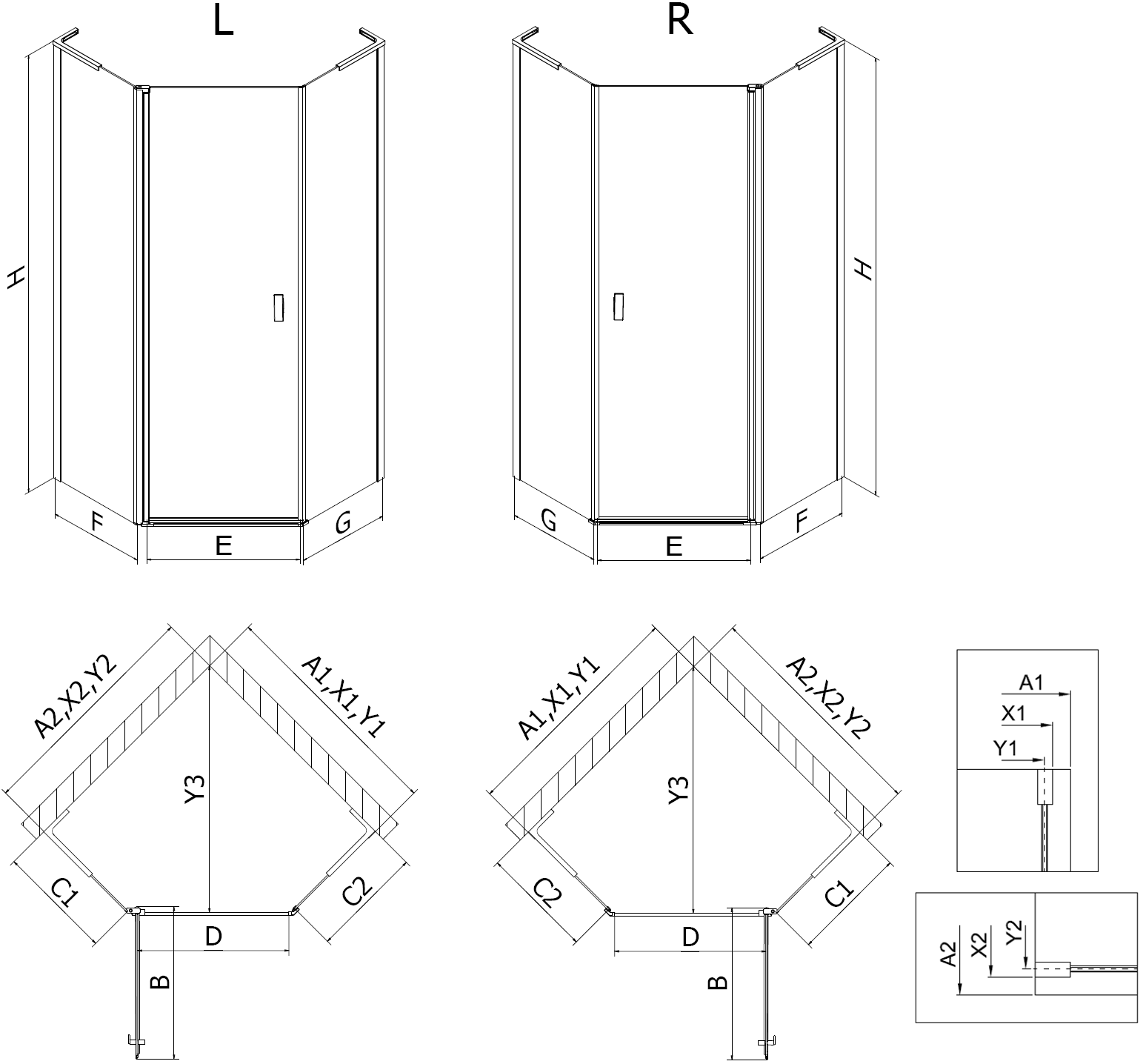 Storlek: 90x90 cm (höger dörr 90 cm, vägg 90 cm)