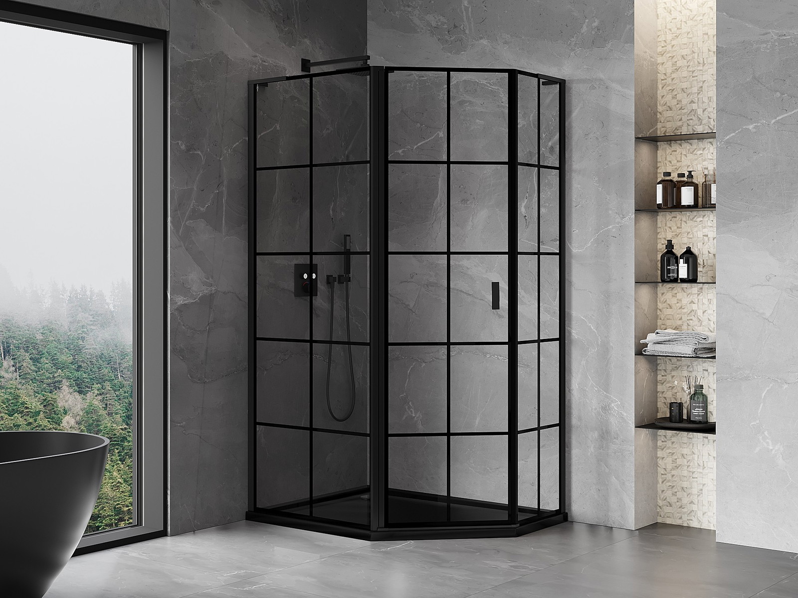 Mexen Mist L asymmetrisk femkantig duschkabin med svängbar dörr vänster 100 x 80 cm, svart mönster, svart