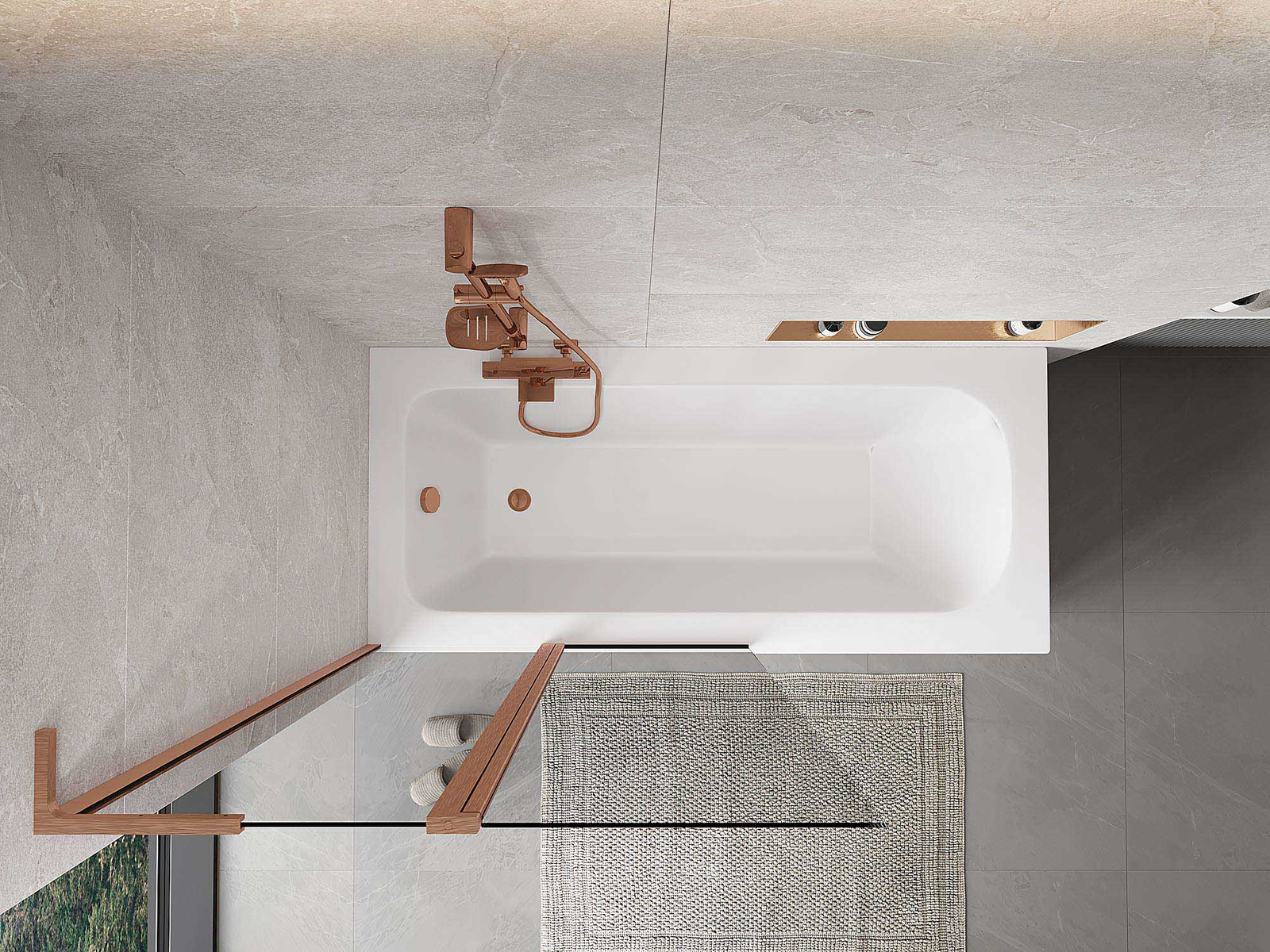 Skärmvägg tillverkad av två vingar med möjlighet att fällas ihop. En sådan lösning sparar mer utrymme i badrummet och möjliggör fri användning av det återstående utrymmet när vi inte använder badzonen.