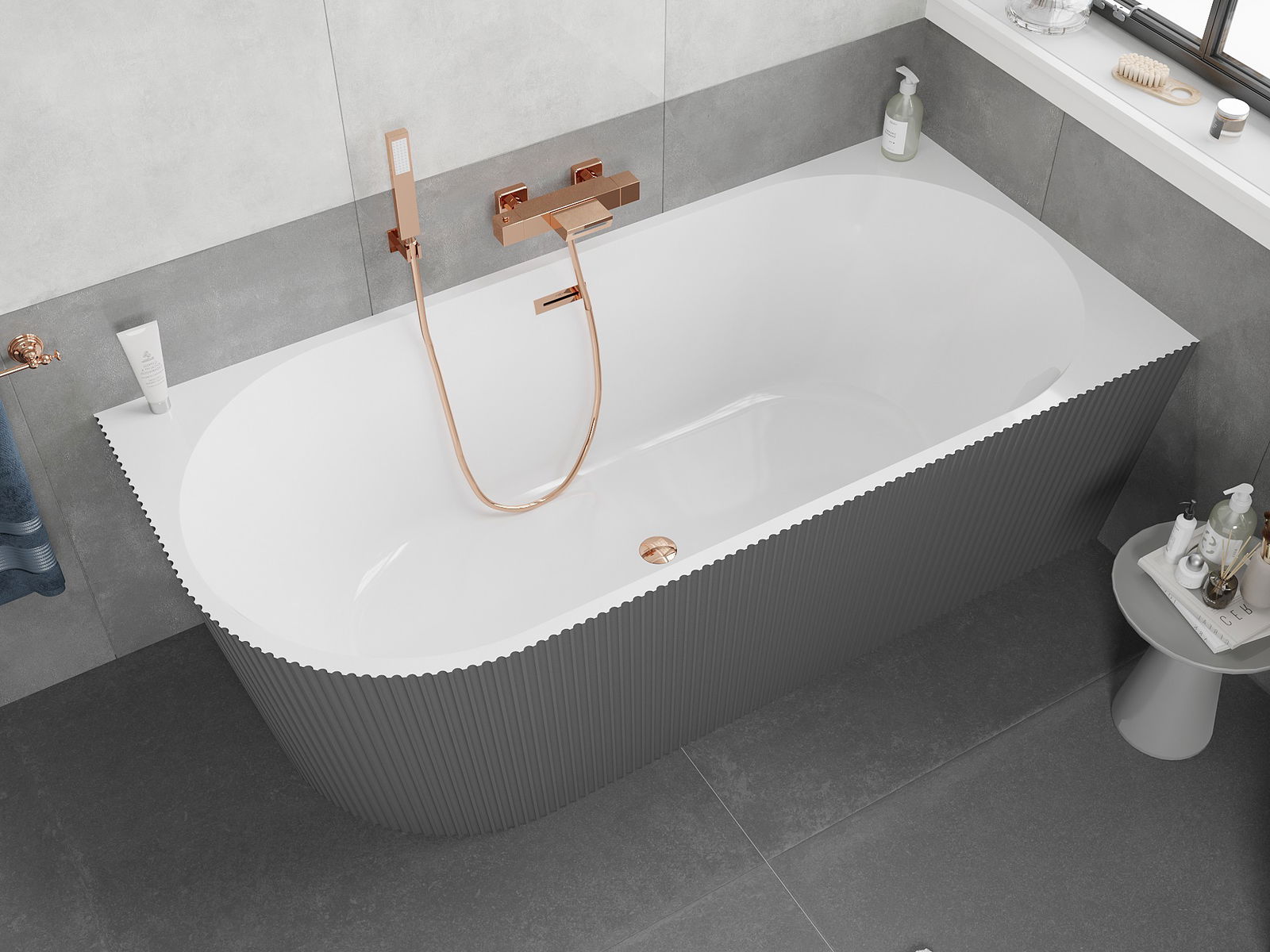 Mexen Silo fristående hörnbadkar höger ribbad 170 x 80 cm, vit/grå, överfyllning roséguld - 52891708062P-60