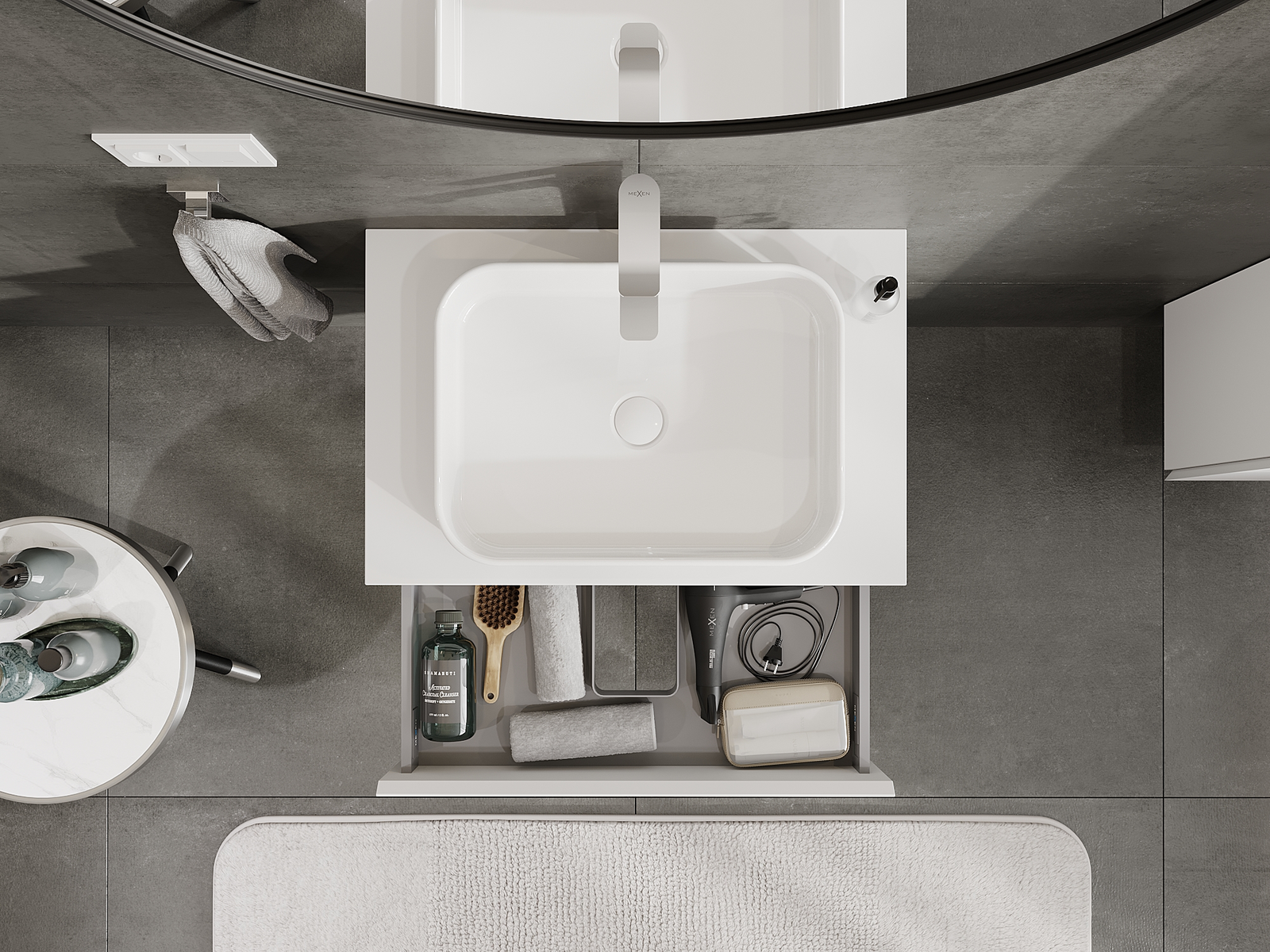 Utskärningen i lådan är utformad på ett sådant sätt att den rymmer vattenlåset som är nödvändigt i tvättställsinstallationer. Tack vare detta kan möbeln installeras fullt ut funktionellt, utan att behöva avstå från utrymme i lådan för installationen.