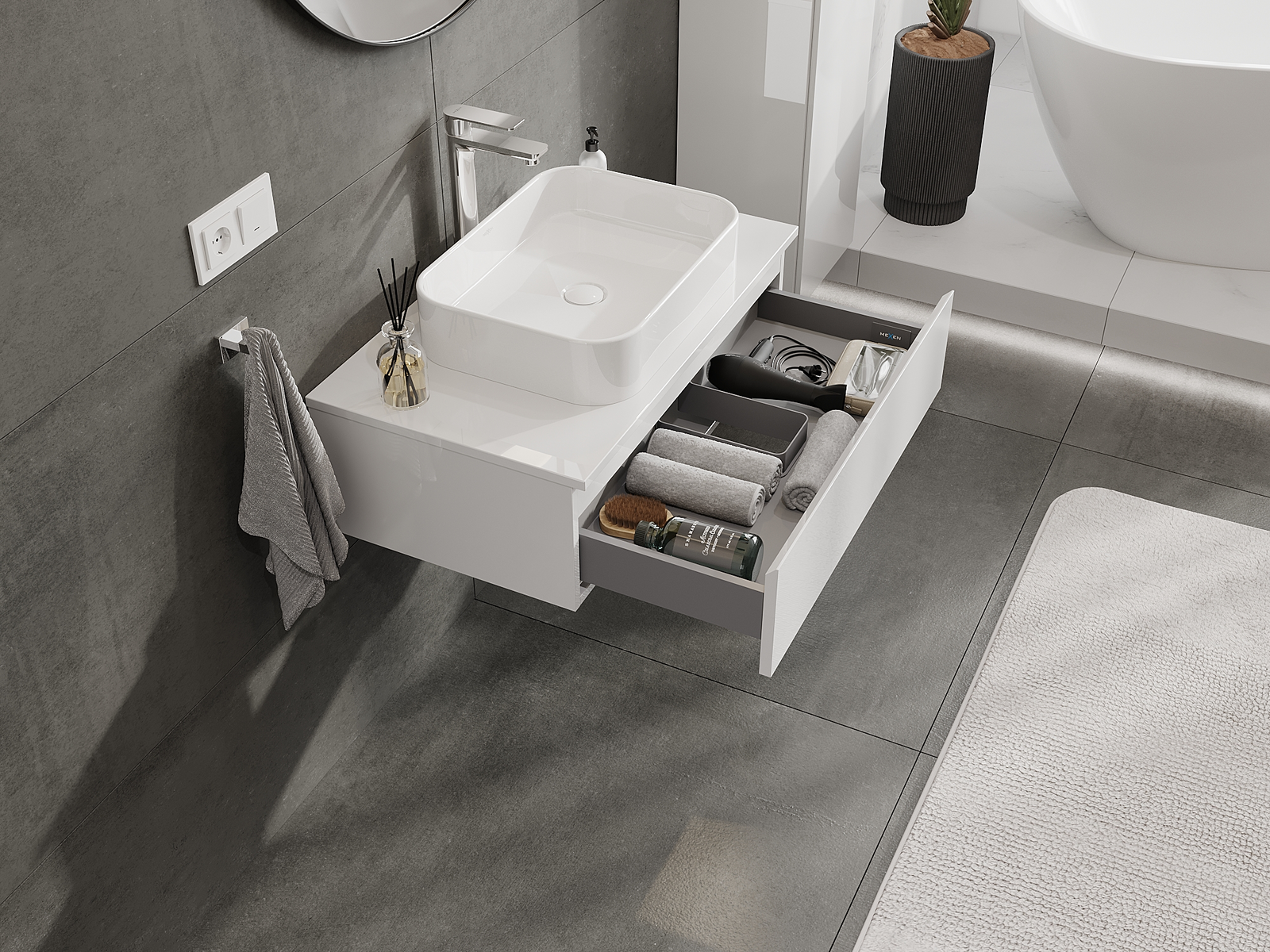 Utskärningen i lådan är utformad på ett sådant sätt att den rymmer vattenlåset som är nödvändigt i tvättställsinstallationer. Tack vare detta kan möbeln installeras fullt ut funktionellt, utan att behöva avstå från utrymme i lådan för installationen.