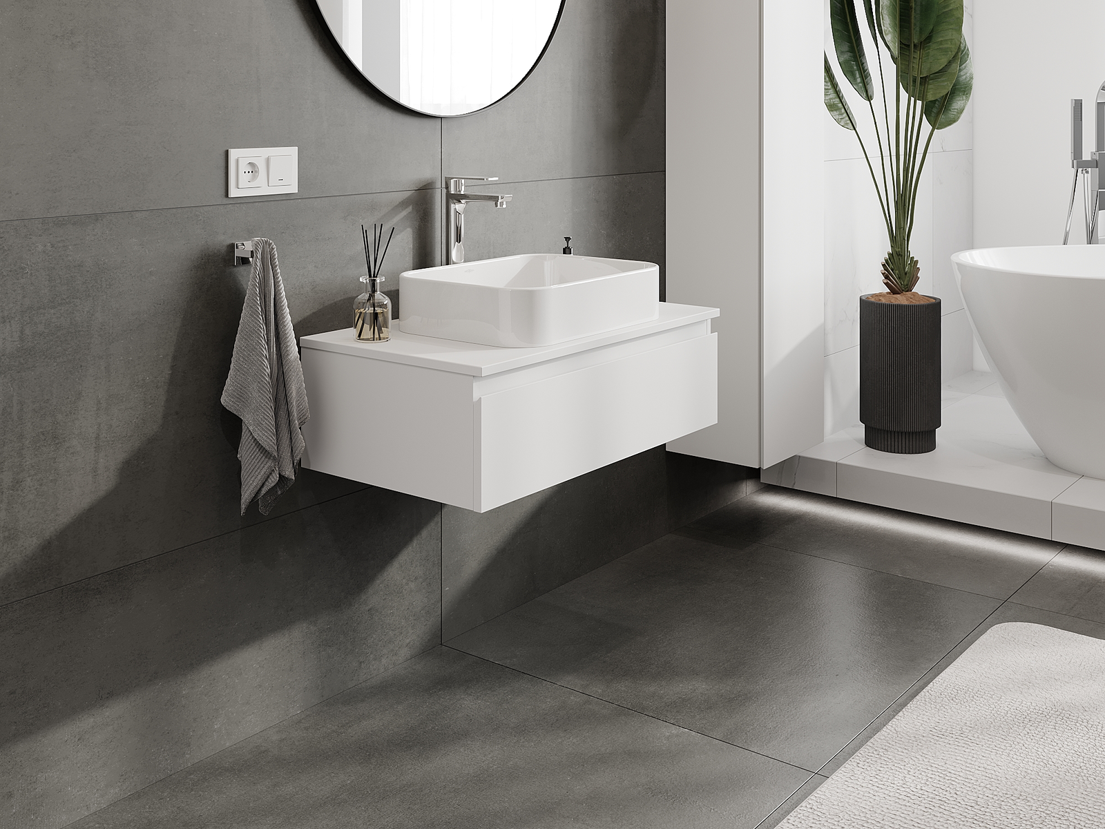 Skivan täckt med högkvalitativ lack är ett utmärkt val för badrummet, den ger ett elegant utseende samt hög motståndskraft mot fukt och repor. Högkvalitativ lack skyddar ytan på bänkskivan, vilket säkerställer dess långvariga hållbarhet, estetik och enkelhet i underhåll.