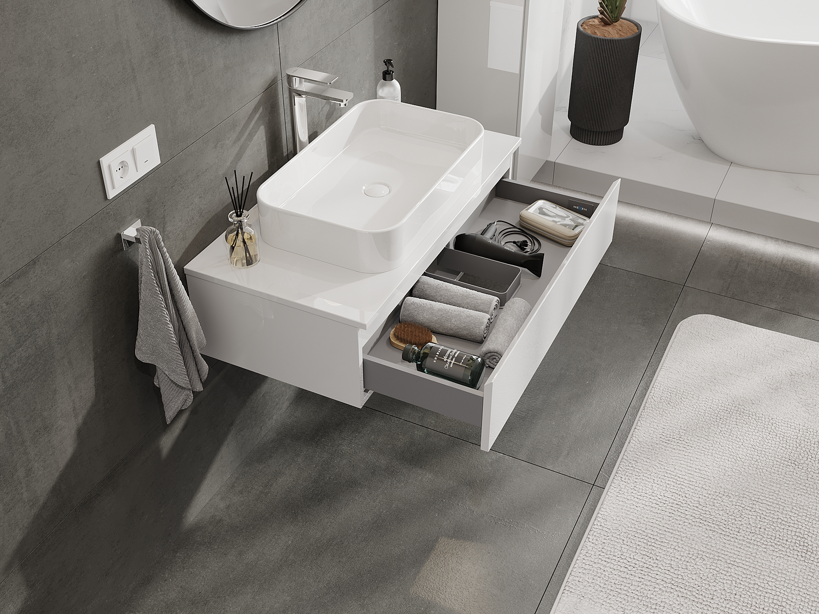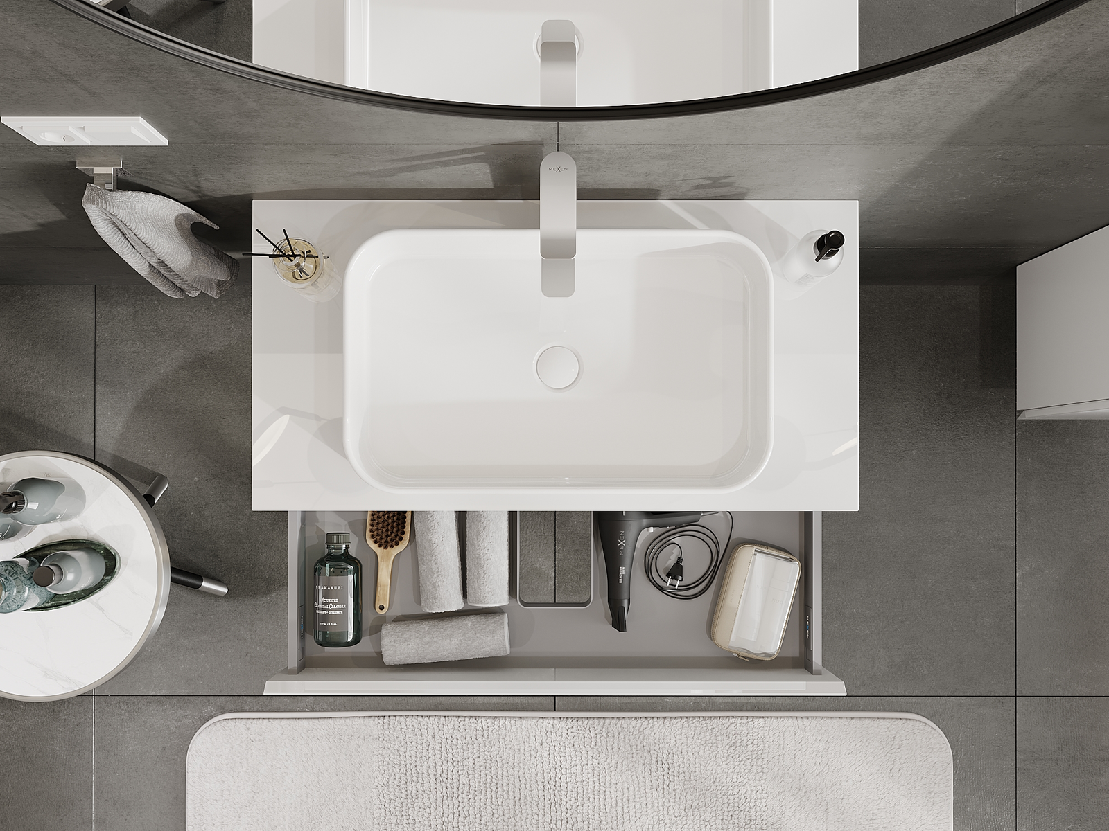Utskärningen i lådan är utformad på ett sådant sätt att den rymmer vattenlåset som är nödvändigt i tvättställsinstallationer. Tack vare detta kan möbeln installeras fullt ut funktionellt, utan att behöva avstå från utrymme i lådan för installationen.