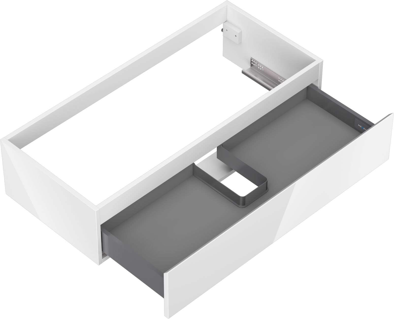 Utskärningen i lådan är utformad på ett sådant sätt att den rymmer vattenlåset som är nödvändigt i tvättställsinstallationer. Tack vare detta kan möbeln installeras fullt ut funktionellt, utan att behöva avstå från utrymme i lådan för installationen.