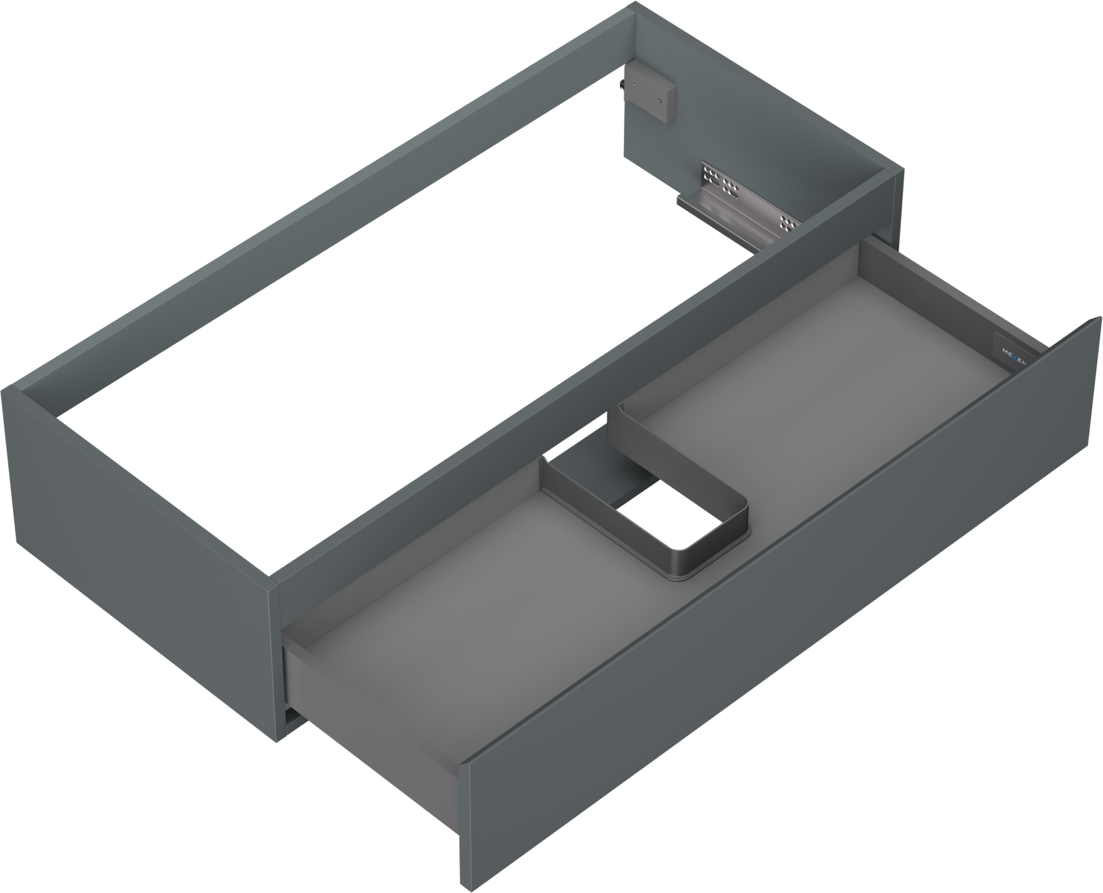 Utskärningen i lådan är utformad på ett sådant sätt att den rymmer vattenlåset som är nödvändigt i tvättställsinstallationer. Tack vare detta kan möbeln installeras fullt ut funktionellt, utan att behöva avstå från utrymme i lådan för installationen.