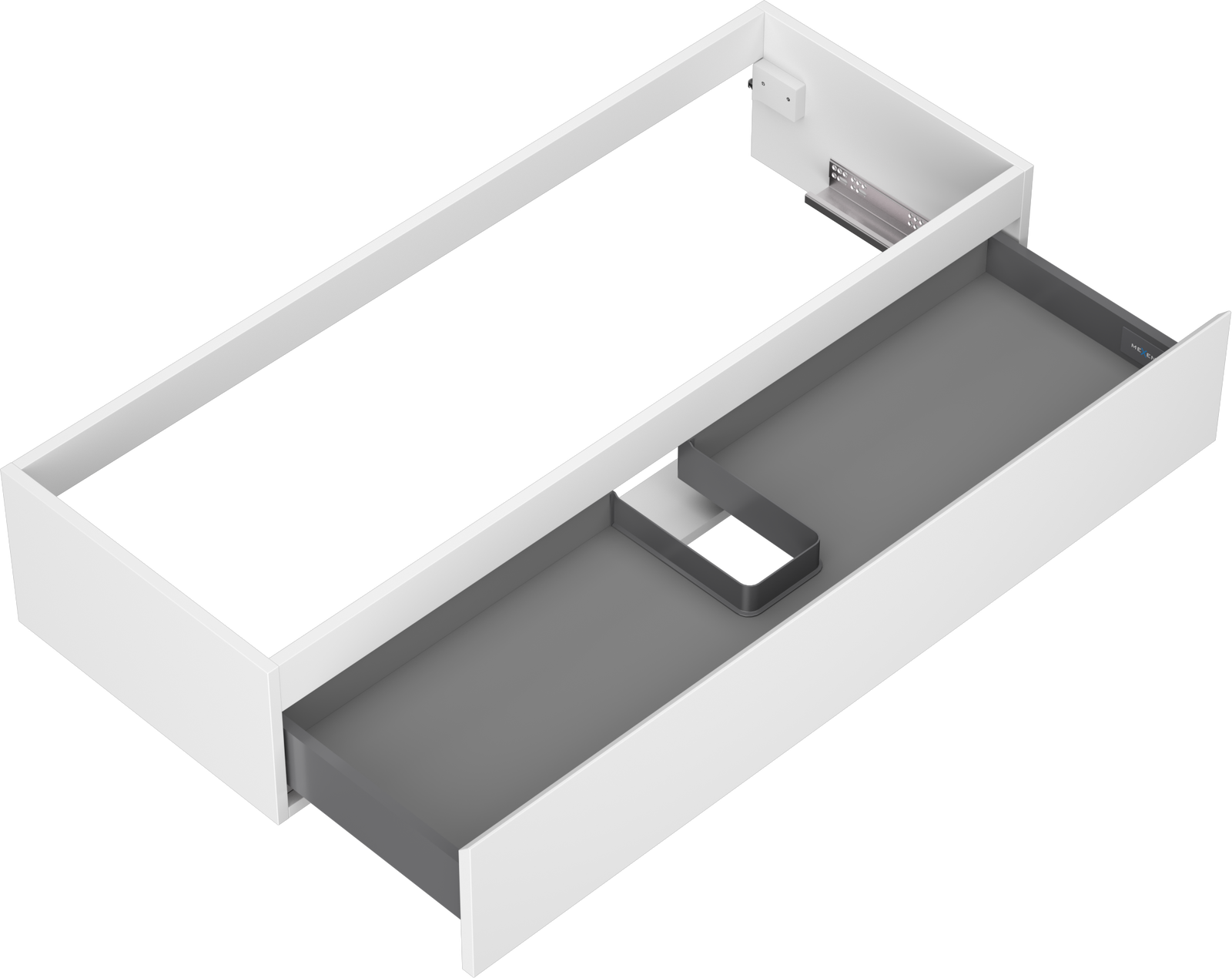 Utskärningen i lådan är utformad på ett sådant sätt att den rymmer vattenlåset som är nödvändigt i tvättställsinstallationer. Tack vare detta kan möbeln installeras fullt ut funktionellt, utan att behöva avstå från utrymme i lådan för installationen.