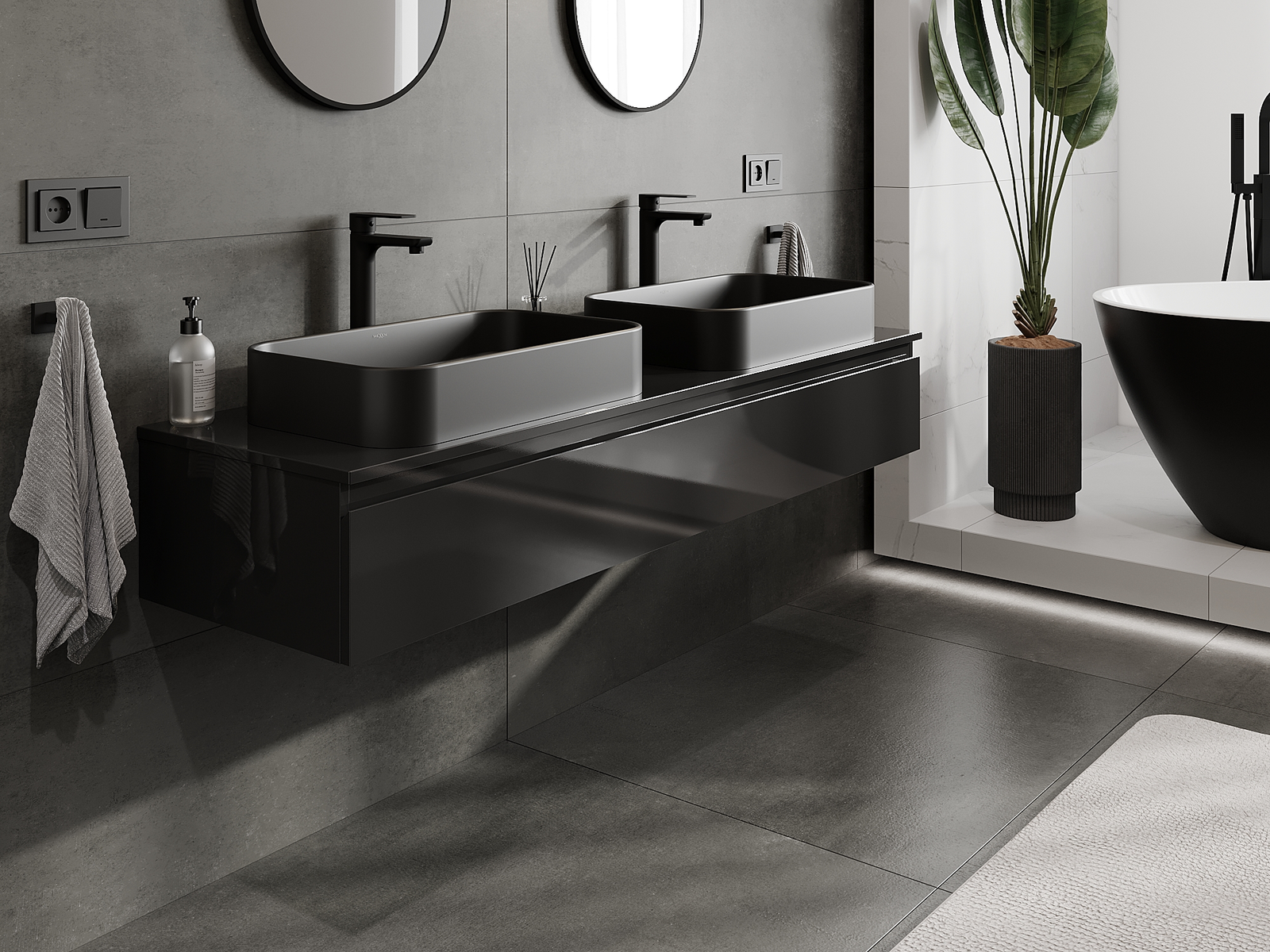 Skivan täckt med högkvalitativ lack är ett utmärkt val för badrummet, den ger ett elegant utseende samt hög motståndskraft mot fukt och repor. Högkvalitativ lack skyddar ytan på bänkskivan, vilket säkerställer dess långvariga hållbarhet, estetik och enkelhet i underhåll.