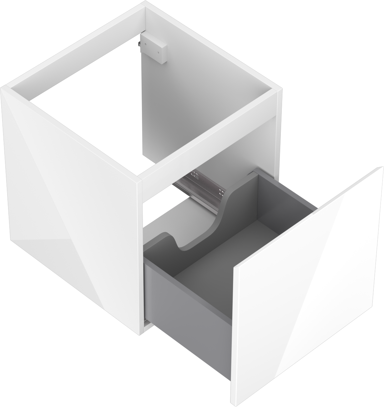 Utskärningen i lådan är utformad på ett sådant sätt att den rymmer vattenlåset som är nödvändigt i tvättställsinstallationer. Tack vare detta kan möbeln installeras fullt ut funktionellt, utan att behöva avstå från utrymme i lådan för installationen.