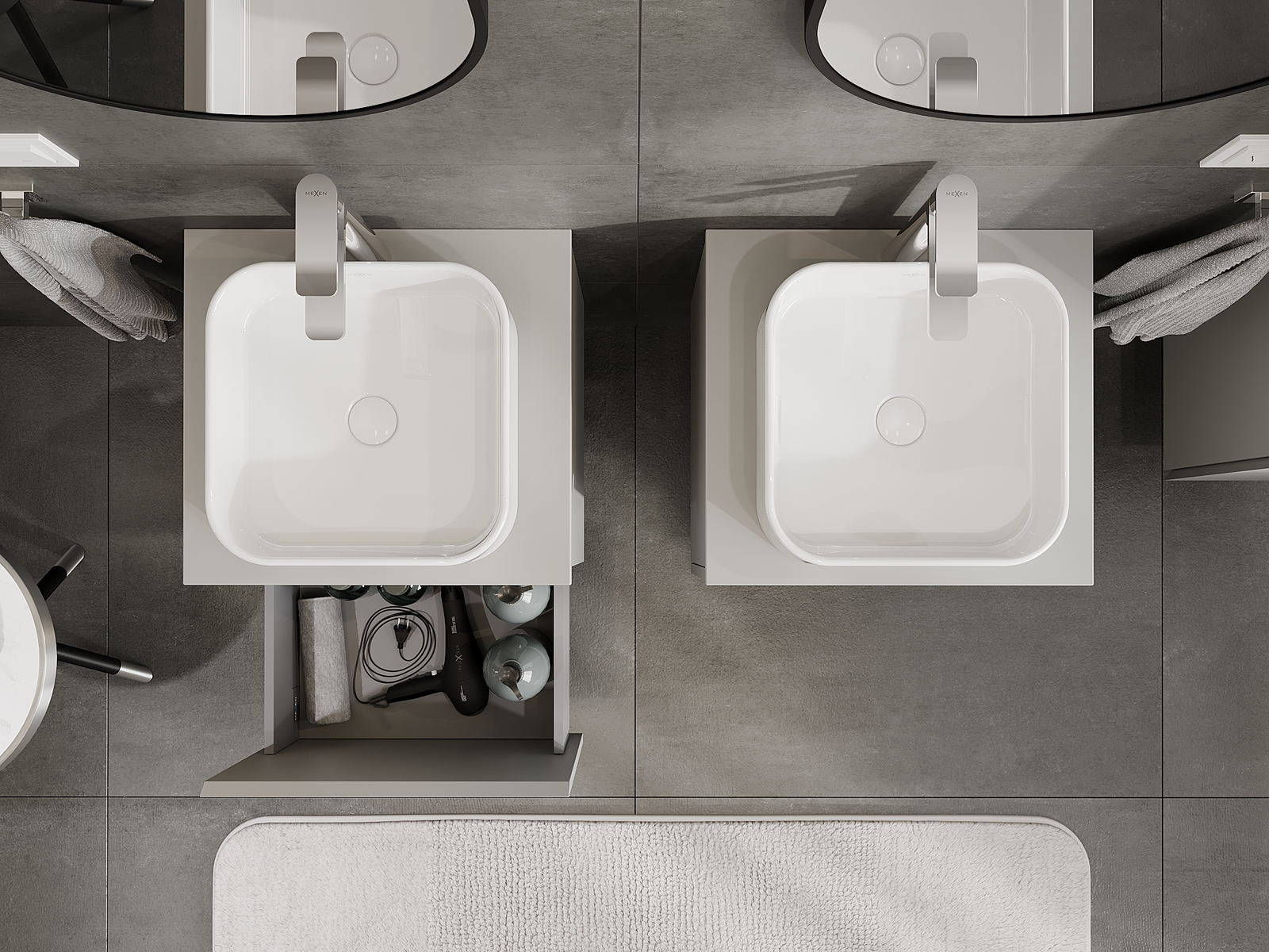 Våra modulära badrumsmöbler kan kombineras i olika färgkonfigurationer, vilket möjliggör fullständig personalisering. Du kan välja både utseende och funktioner för respektive delar, vilket gör att möblerna kan anpassas till dina egna stilistiska och funktionella preferenser.