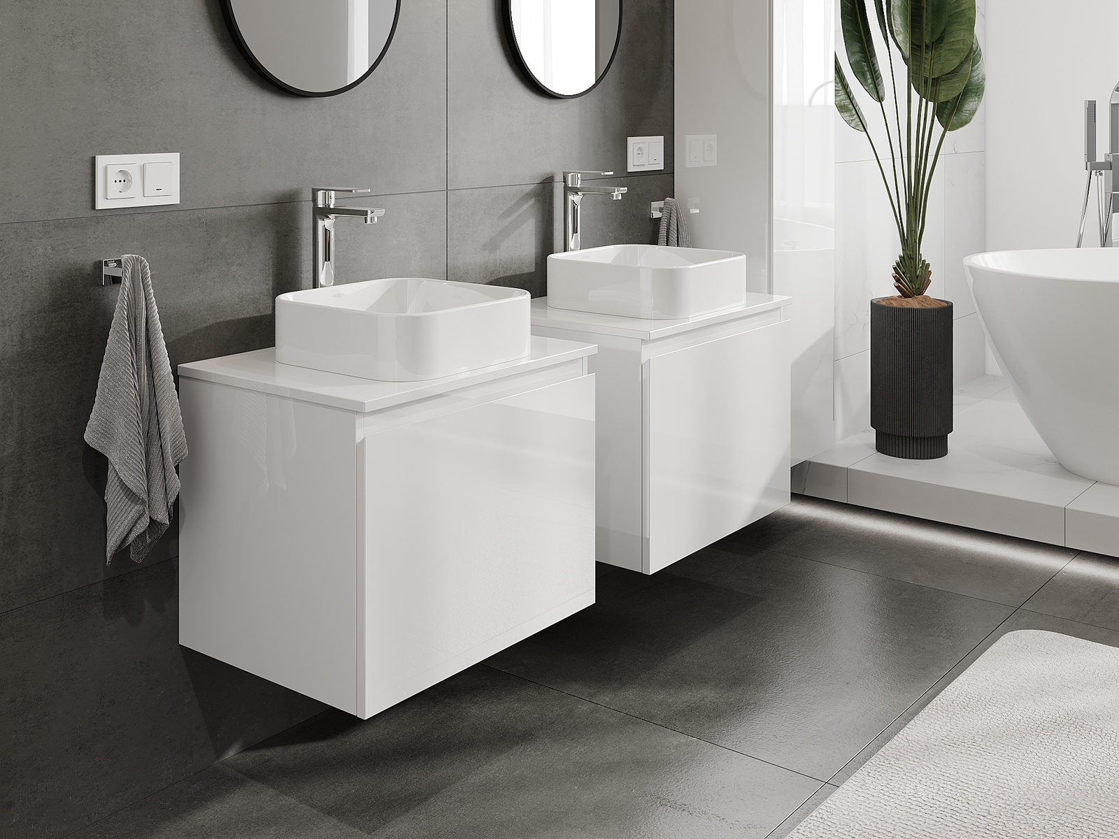 Skivan täckt med högkvalitativ lack är ett utmärkt val för badrummet, den ger ett elegant utseende samt hög motståndskraft mot fukt och repor. Högkvalitativ lack skyddar ytan på bänkskivan, vilket säkerställer dess långvariga hållbarhet, estetik och enkelhet i underhåll.