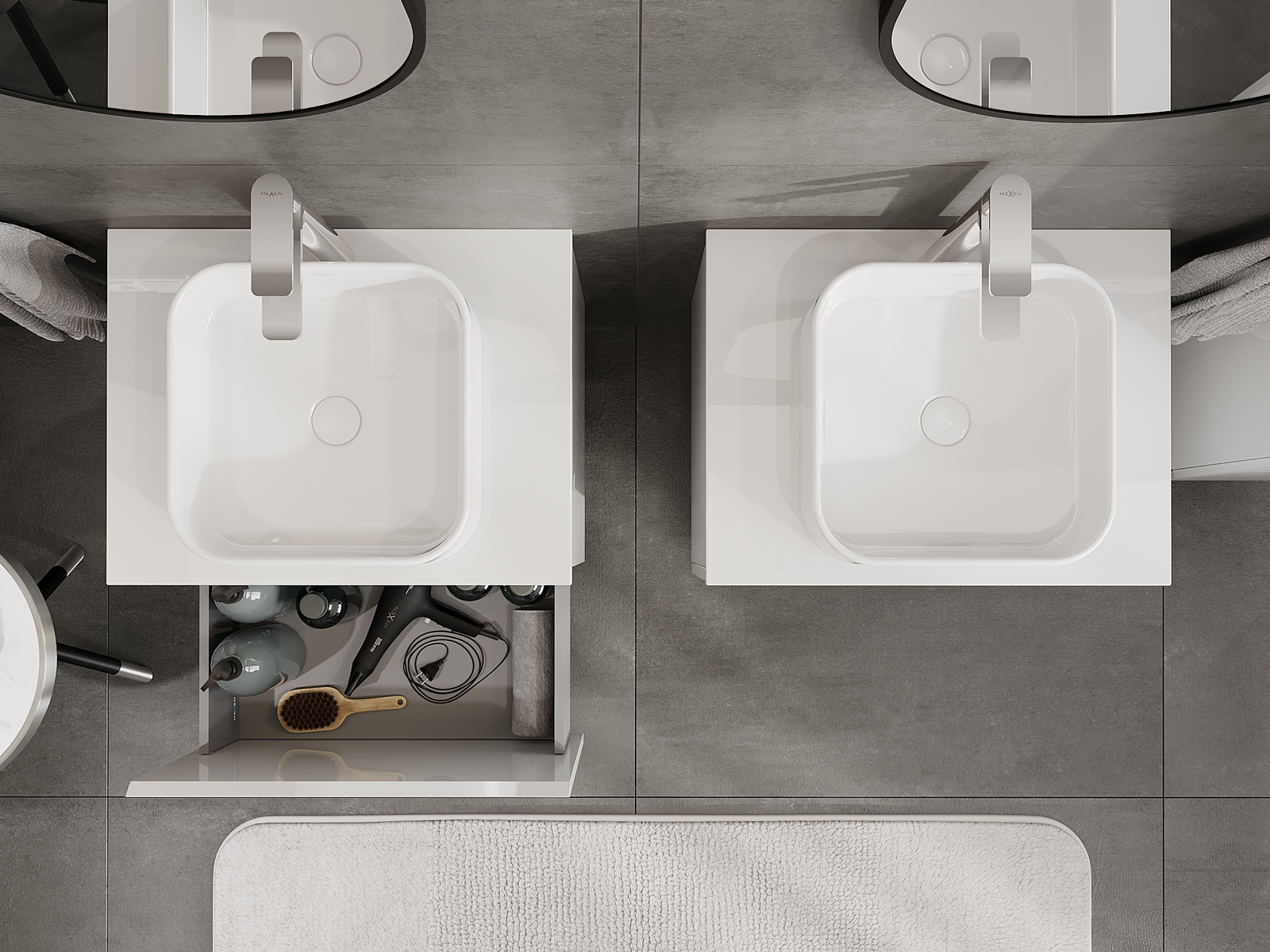 Utskärningen i lådan är utformad på ett sådant sätt att den rymmer vattenlåset som är nödvändigt i tvättställsinstallationer. Tack vare detta kan möbeln installeras fullt ut funktionellt, utan att behöva avstå från utrymme i lådan för installationen.