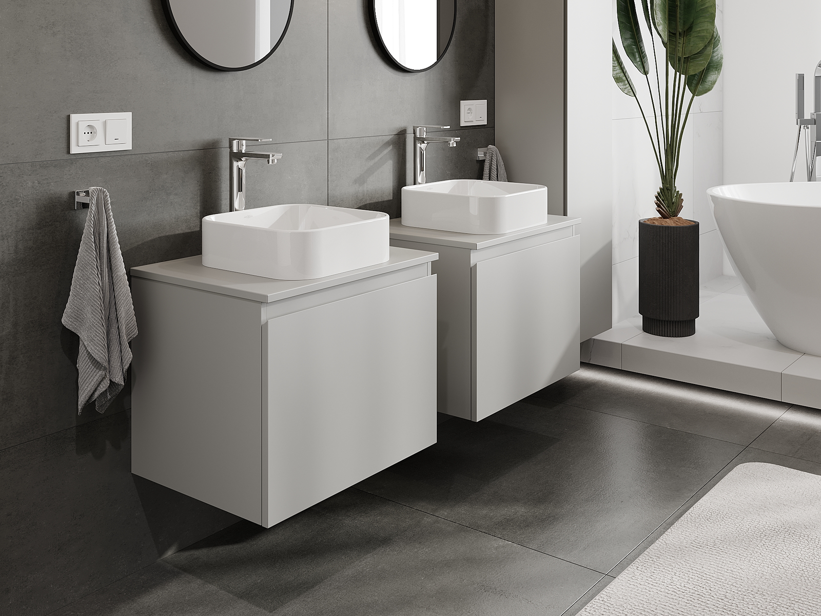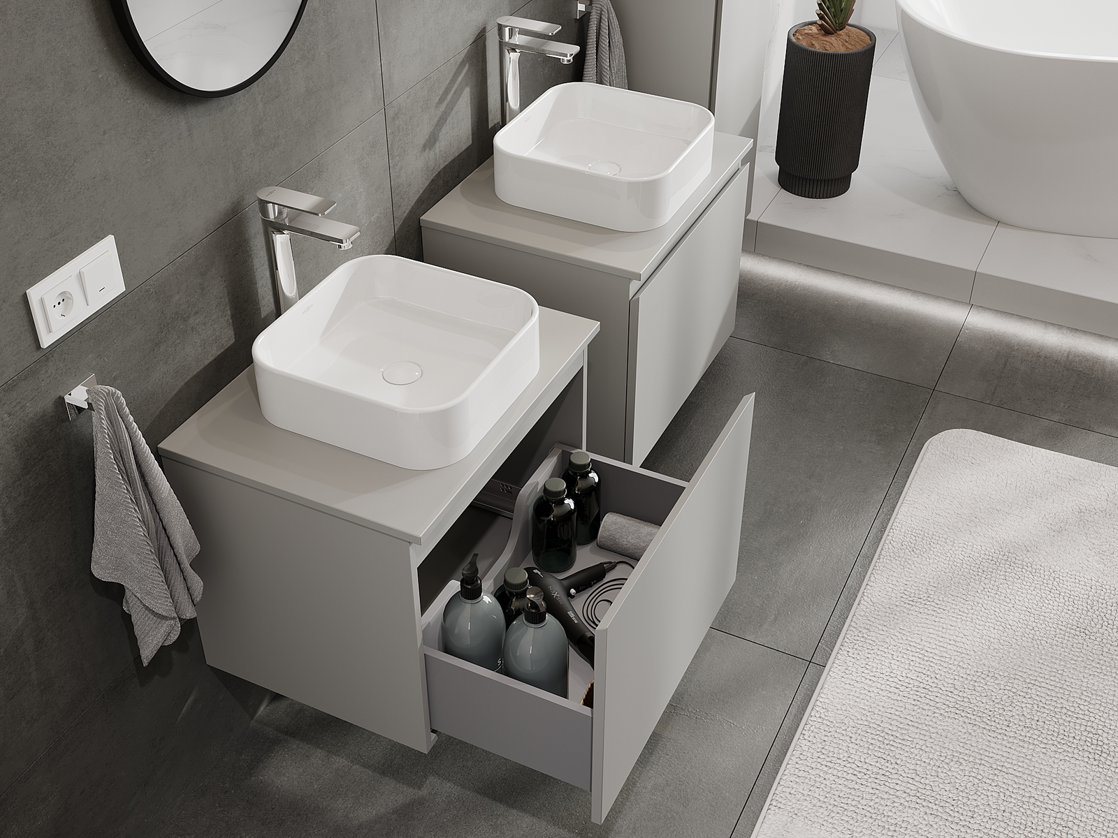 Våra modulära badrumsmöbler kan kombineras i olika färgkonfigurationer, vilket möjliggör fullständig personalisering. Du kan välja både utseende och funktioner för respektive delar, vilket gör att möblerna kan anpassas till dina egna stilistiska och funktionella preferenser.