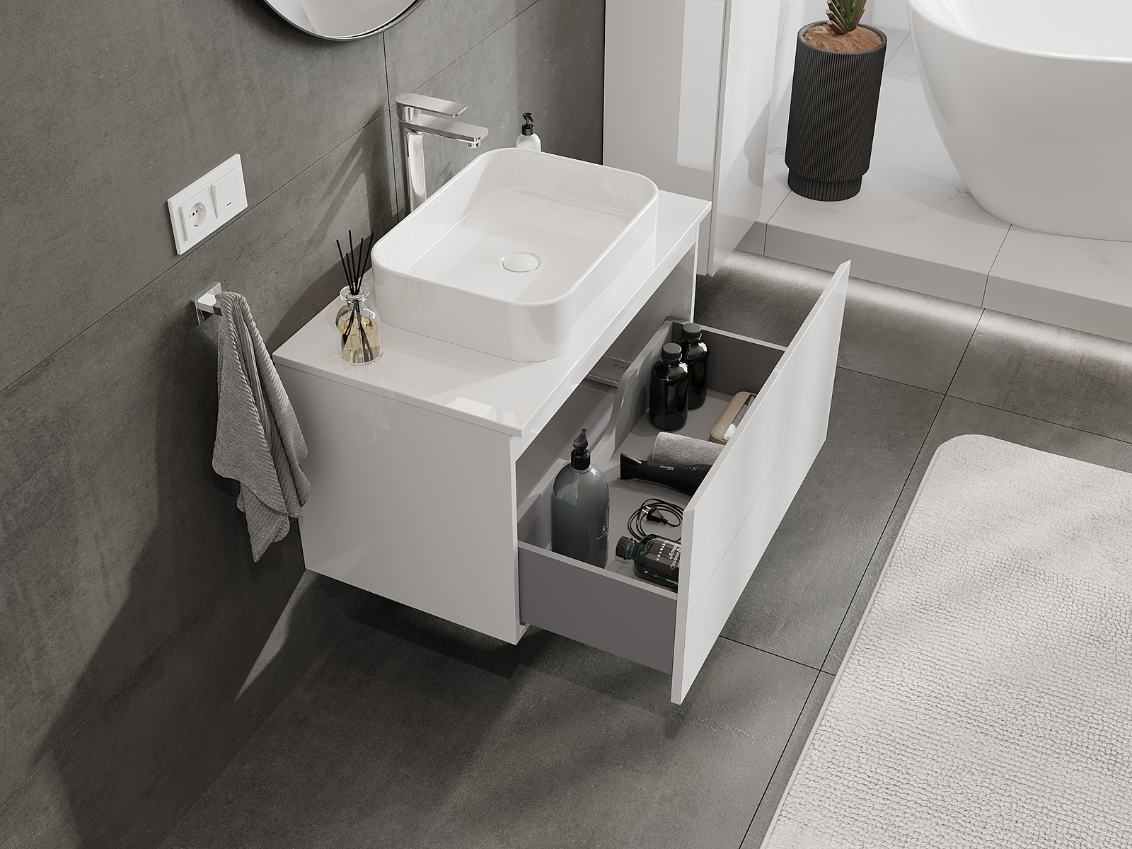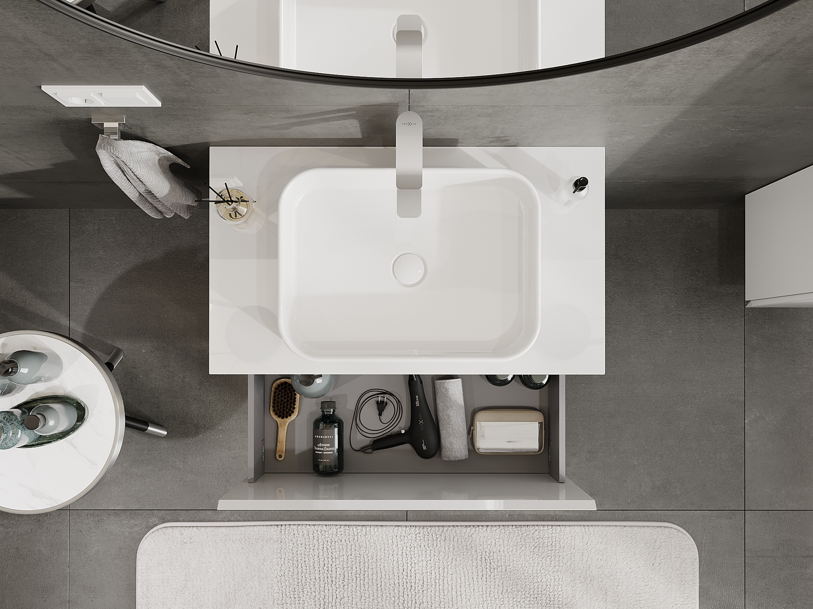 Utskärningen i lådan är utformad på ett sådant sätt att den rymmer vattenlåset som är nödvändigt i tvättställsinstallationer. Tack vare detta kan möbeln installeras fullt ut funktionellt, utan att behöva avstå från utrymme i lådan för installationen.
