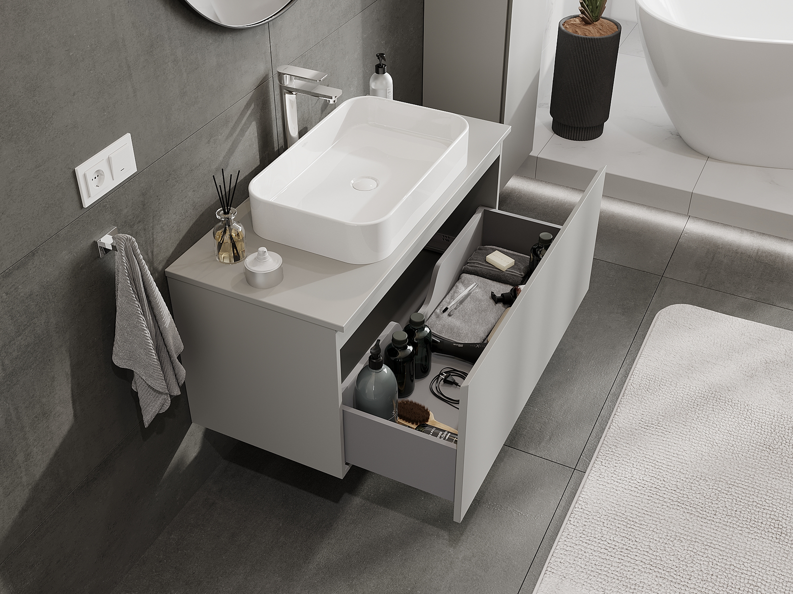 Utskärningen i lådan är utformad på ett sådant sätt att den rymmer vattenlåset som är nödvändigt i tvättställsinstallationer. Tack vare detta kan möbeln installeras fullt ut funktionellt, utan att behöva avstå från utrymme i lådan för installationen.