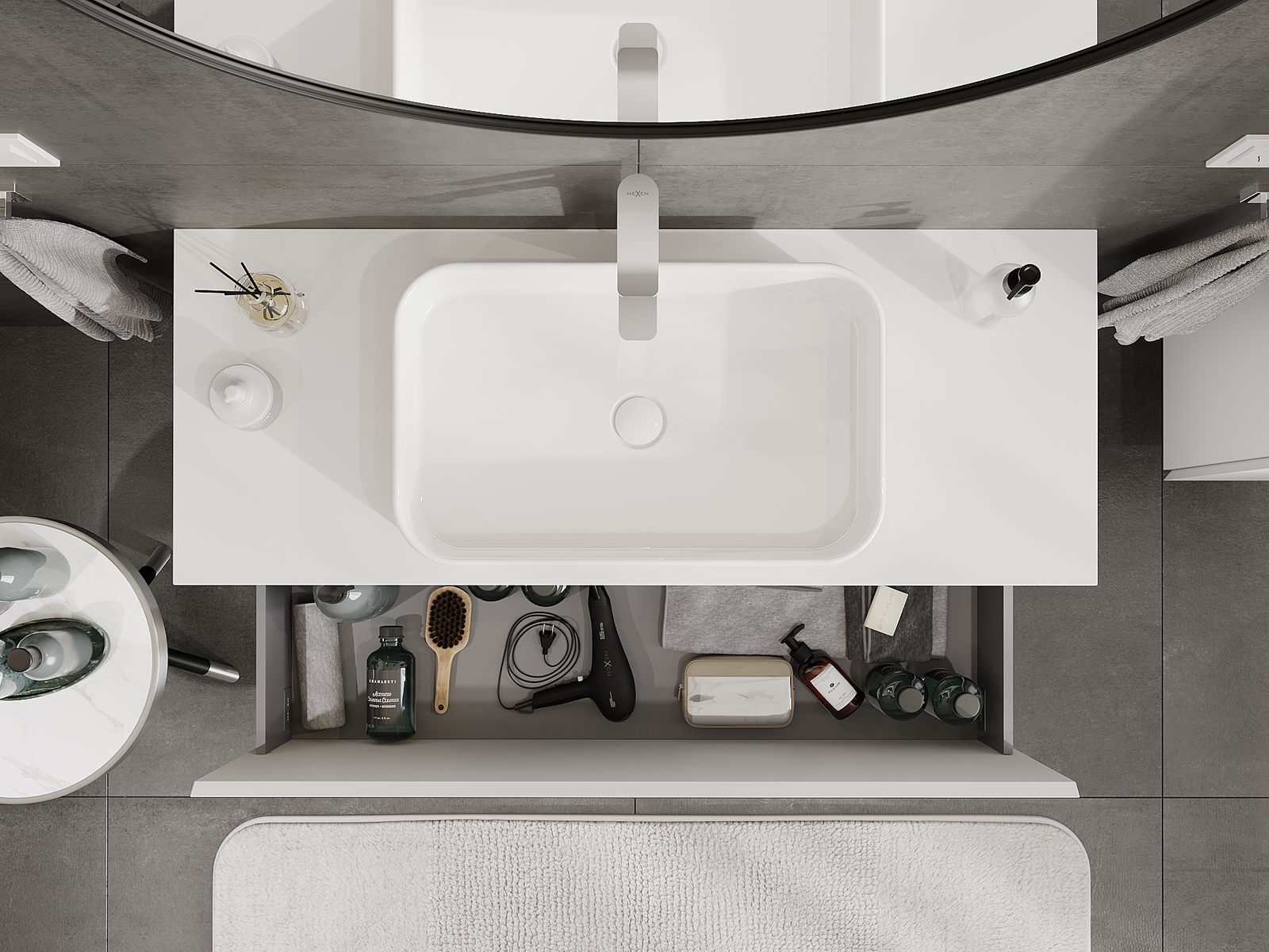 Utskärningen i lådan är utformad på ett sådant sätt att den rymmer vattenlåset som är nödvändigt i tvättställsinstallationer. Tack vare detta kan möbeln installeras fullt ut funktionellt, utan att behöva avstå från utrymme i lådan för installationen.