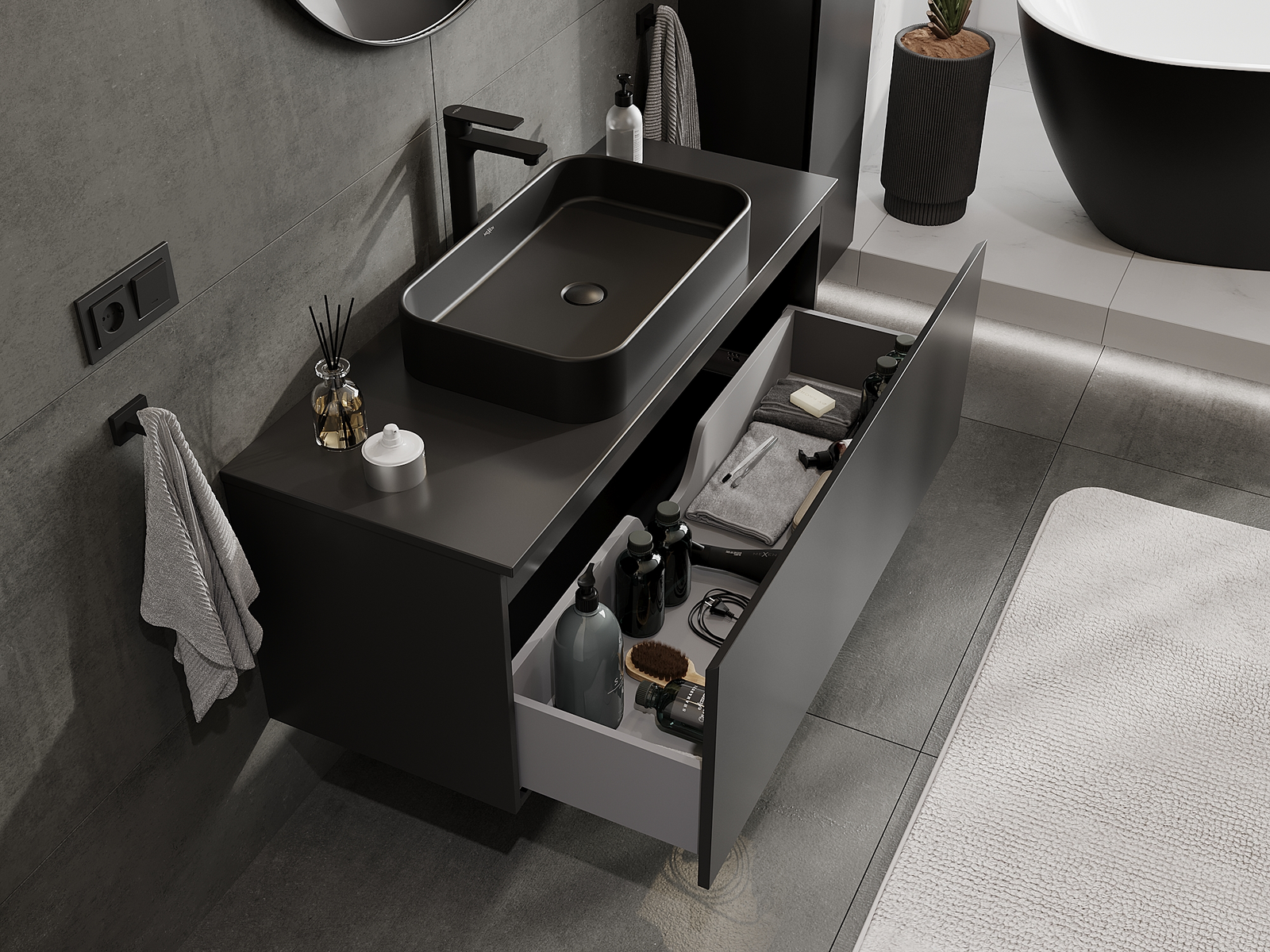Utskärningen i lådan är utformad på ett sådant sätt att den rymmer vattenlåset som är nödvändigt i tvättställsinstallationer. Tack vare detta kan möbeln installeras fullt ut funktionellt, utan att behöva avstå från utrymme i lådan för installationen.